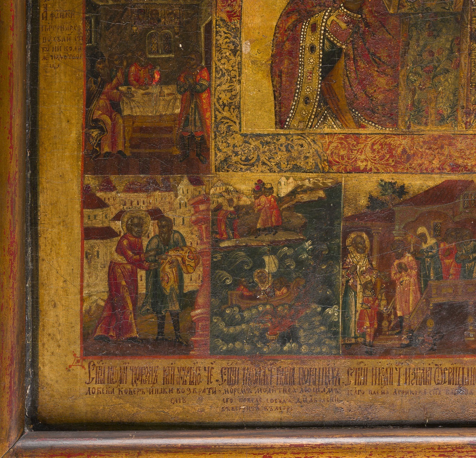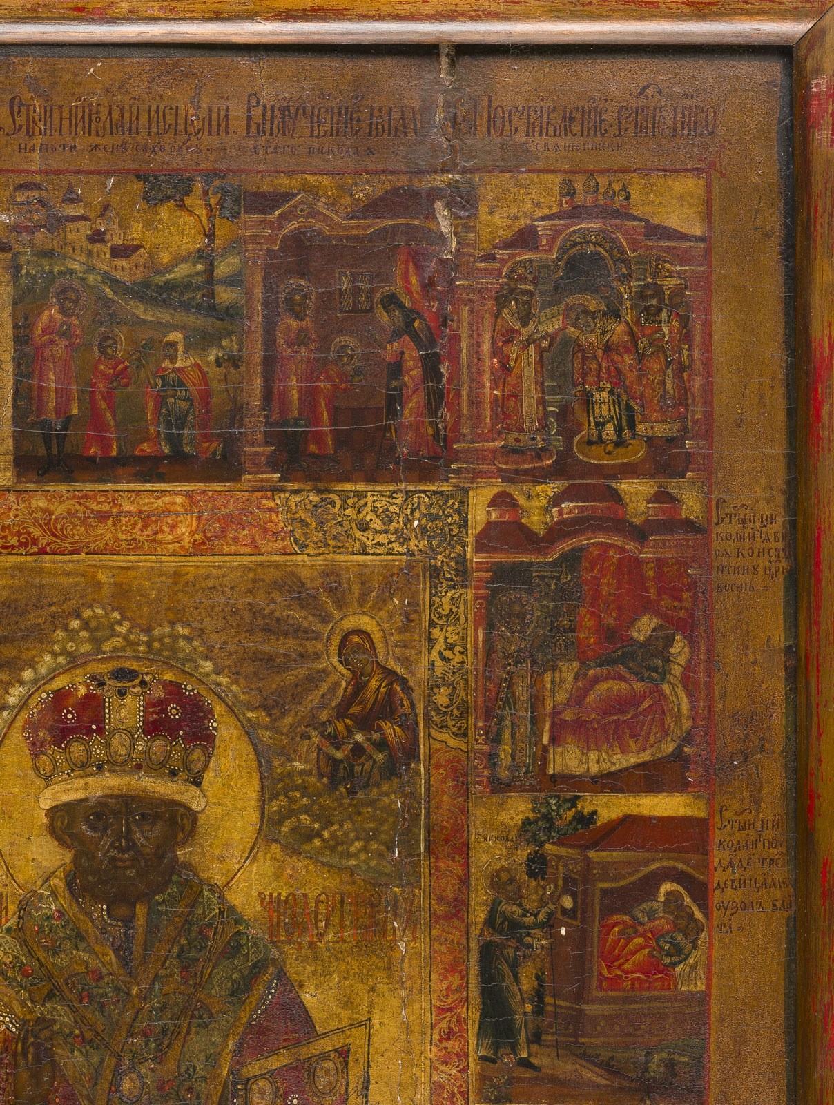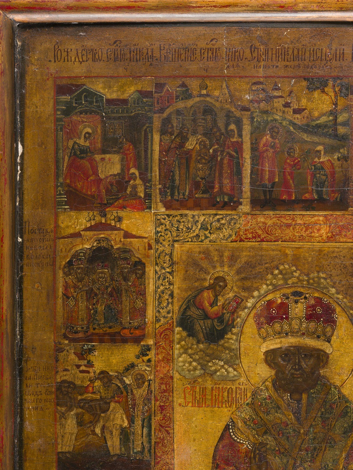 A VERY LARGE AND FINE VITA ICON OF ST. NICHOLAS OF MYRA Russian, circa 1800 Tempera on wood panel. Finely rendered in great detail on gold ground. Portrayed frontal, half-length, dressed in elaborate garments, the miniature figures of Christ and his Mother, each on clouds flanking the saint. The main scene framed by a decorative border of baroque-style foliate scrolls, 16 scenes all around narrating the life of the saint. Vertical crack, minor losses, minimally restored. 55.5 x 42.3 cm (with frame).