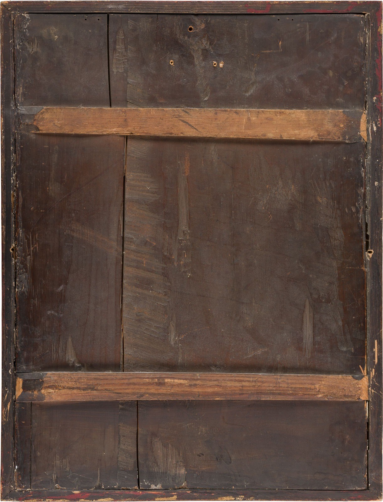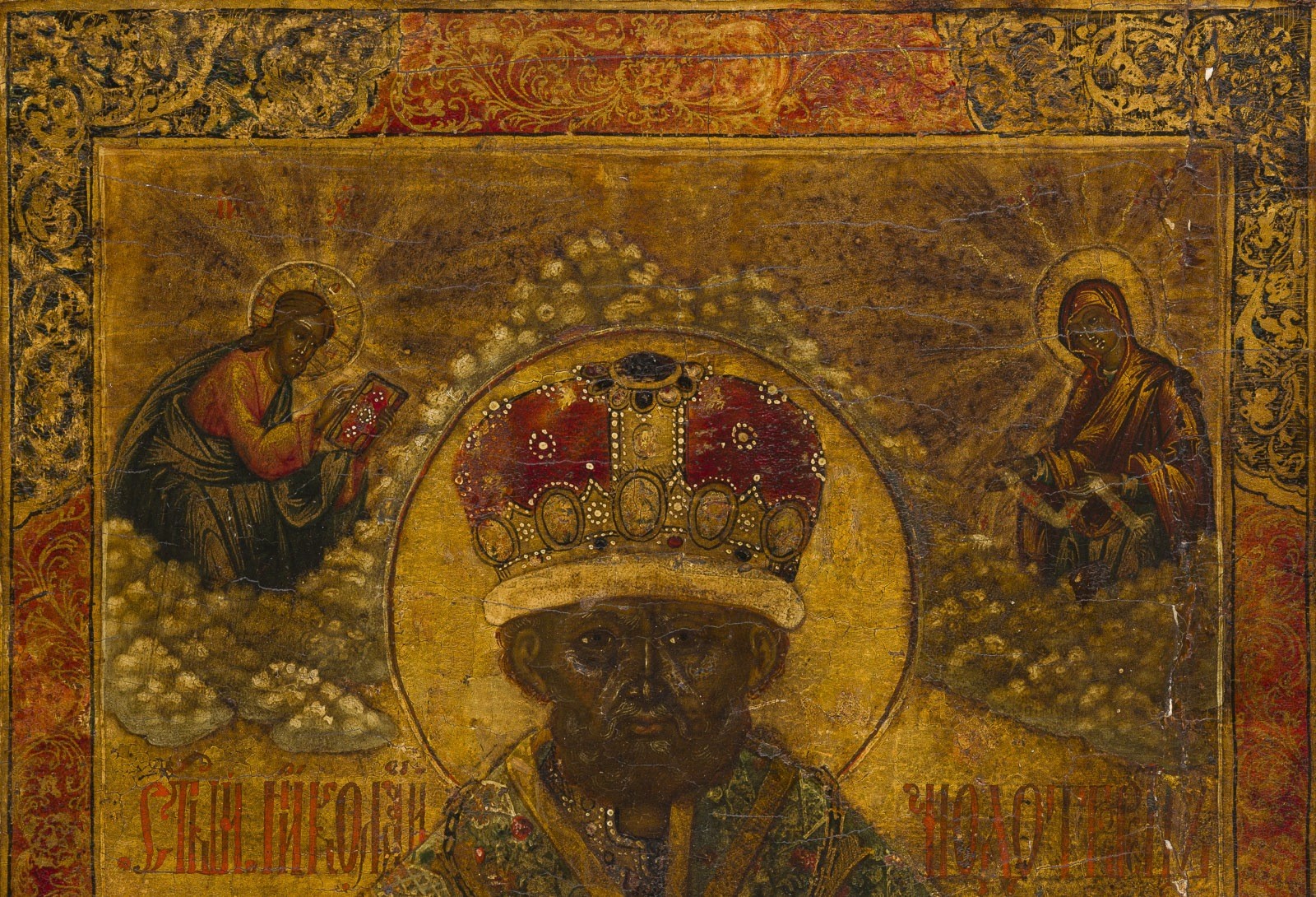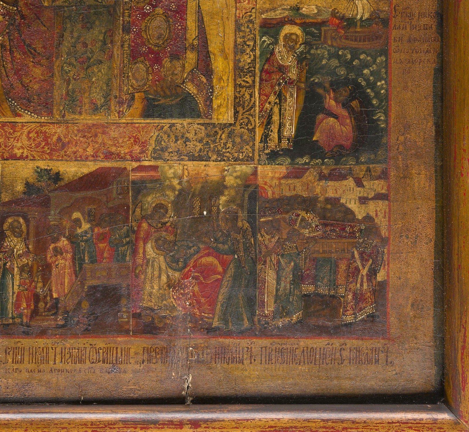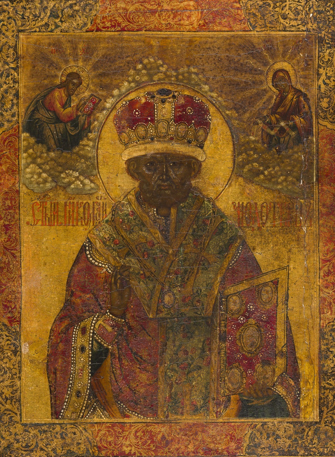 A VERY LARGE AND FINE VITA ICON OF ST. NICHOLAS OF MYRA Russian, circa 1800 Tempera on wood panel. Finely rendered in great detail on gold ground. Portrayed frontal, half-length, dressed in elaborate garments, the miniature figures of Christ and his Mother, each on clouds flanking the saint. The main scene framed by a decorative border of baroque-style foliate scrolls, 16 scenes all around narrating the life of the saint. Vertical crack, minor losses, minimally restored. 55.5 x 42.3 cm (with frame).