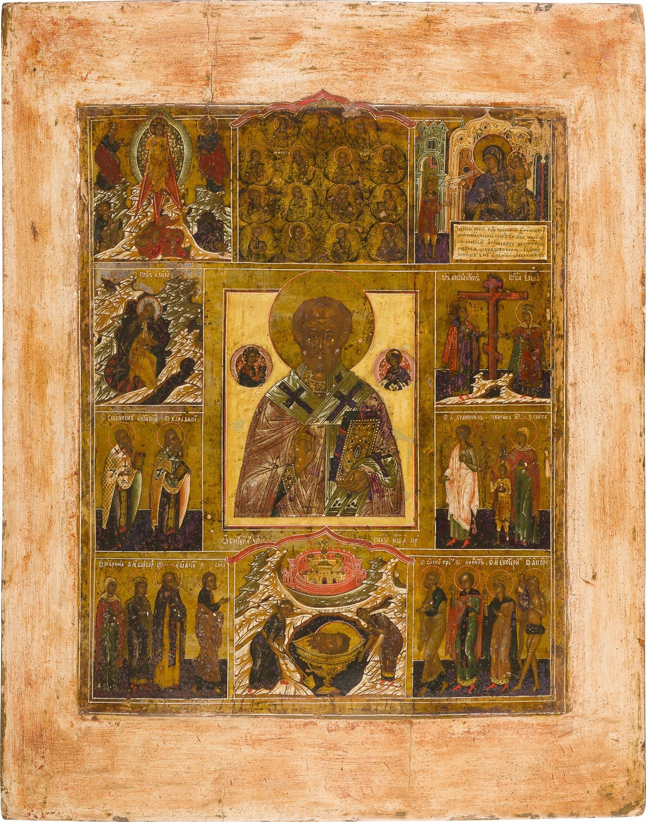 GROSSFORMATIGE UND SELTENE MEHRFELDER-IKONE MIT DEM HEILIGEN NIKOLAUS VON MYRA, DNE APOSTELN UND HEILIGEN SOWIE FESTTAGEN UND DER GOTTESMUTTER 'UNERWARTETE FREUDE'