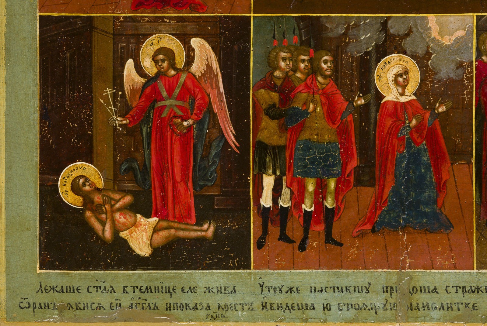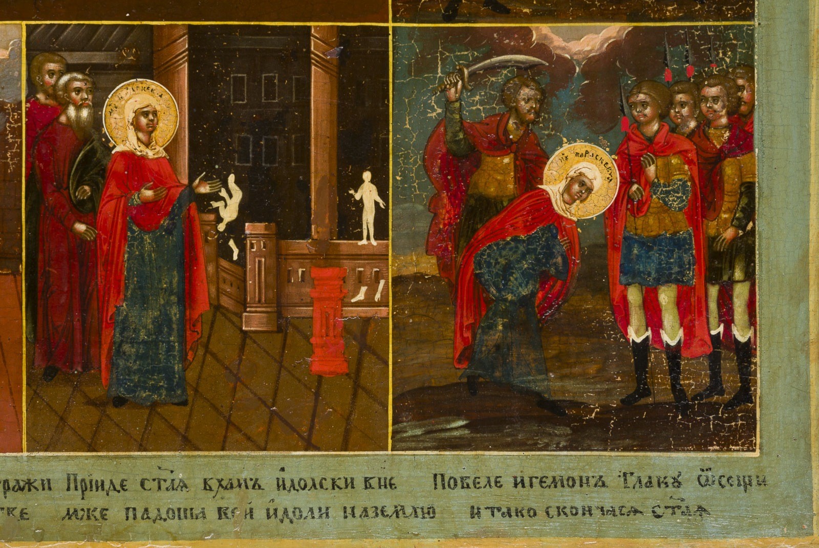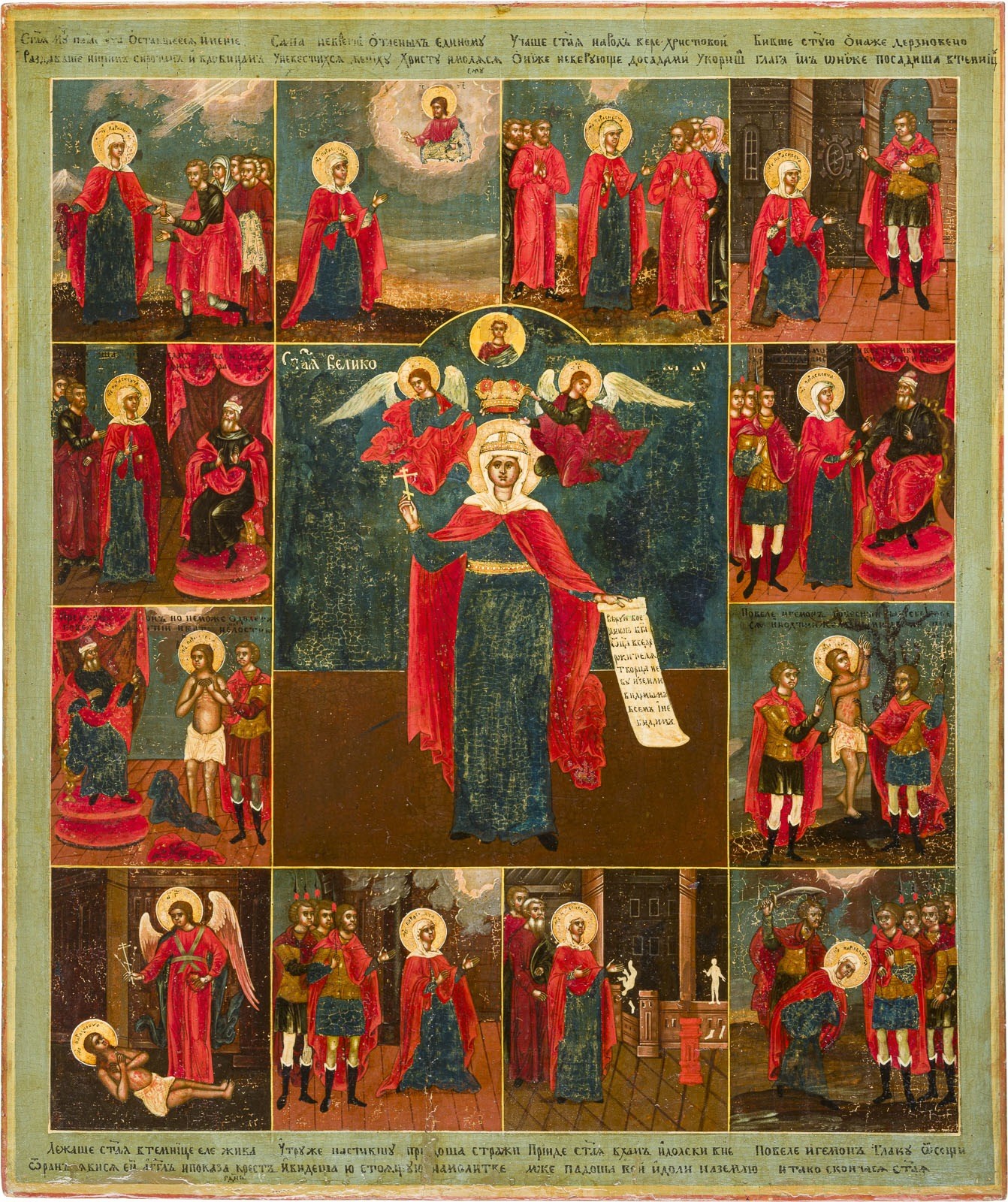 A RARE AND LARGE VITA ICON OF ST. PARASKEVA Russian, early 19th century Tempera on wood panel. The haloes made of gold. The martyr saint depicted frontally and full-length, surrounded by twelve scenes illustrating events from her life and her martyrdom. Rendered in a fine detailed manner with reds and greens. The faces modelled delicately with brown and lighter areas of pink, the elegant features more clearly defined with fine white brushstrokes. Minor areas od retouching. 53.3 x 44.6 cm.