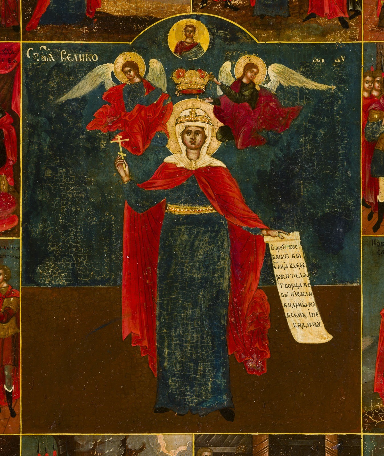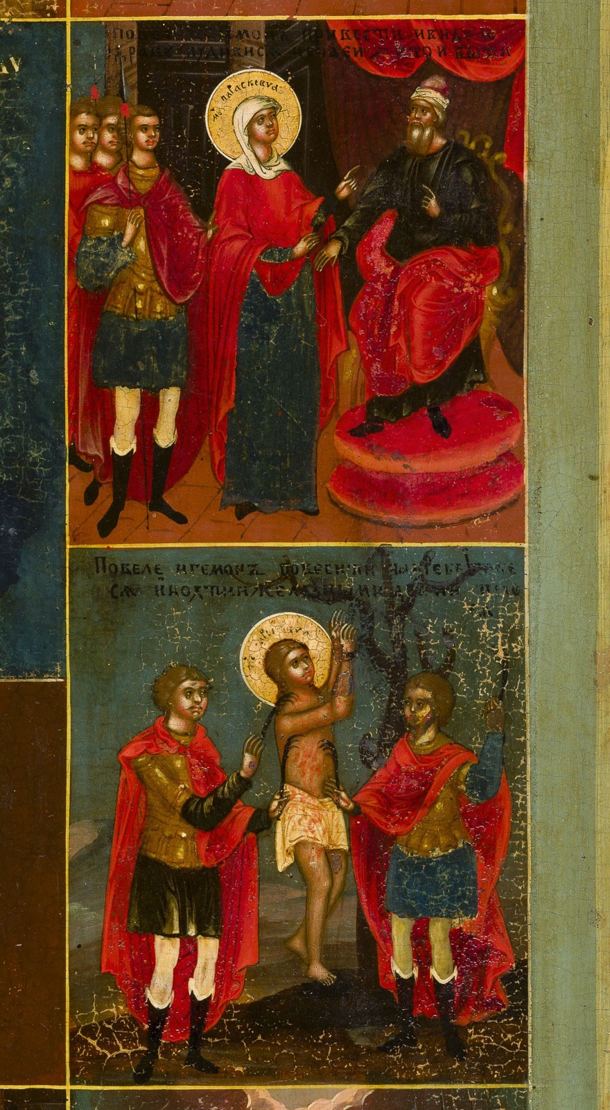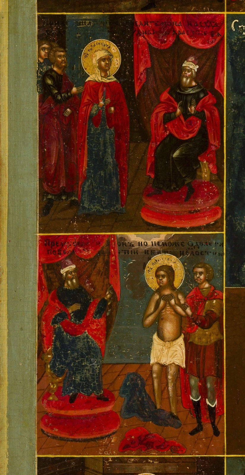 A RARE AND LARGE VITA ICON OF ST. PARASKEVA Russian, early 19th century Tempera on wood panel. The haloes made of gold. The martyr saint depicted frontally and full-length, surrounded by twelve scenes illustrating events from her life and her martyrdom. Rendered in a fine detailed manner with reds and greens. The faces modelled delicately with brown and lighter areas of pink, the elegant features more clearly defined with fine white brushstrokes. Minor areas od retouching. 53.3 x 44.6 cm.