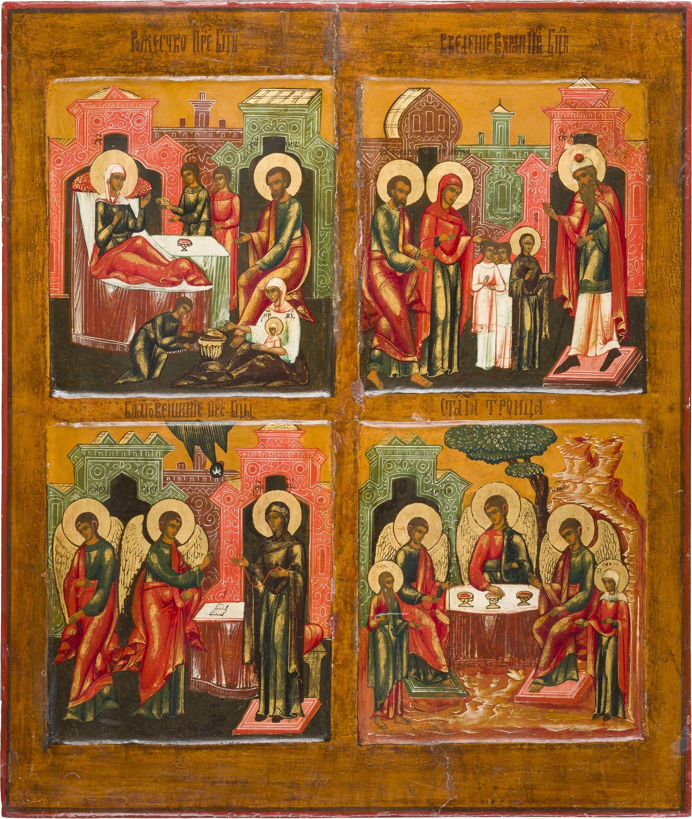 A VERY LARGE QUADRI-PARTITE ICON SHOWING THE NATIVITY OF THE MOTHER OF GOD, THE ENTRY INTO THE TEMPLE, THE ANNUNCIATION AND THE OLD TESTAMENT TRINITY Russian, 19th century Tempera on wood panel with kovcheg. The haloes made of gold. Partially restored. 61.8 x 52.5 cm.