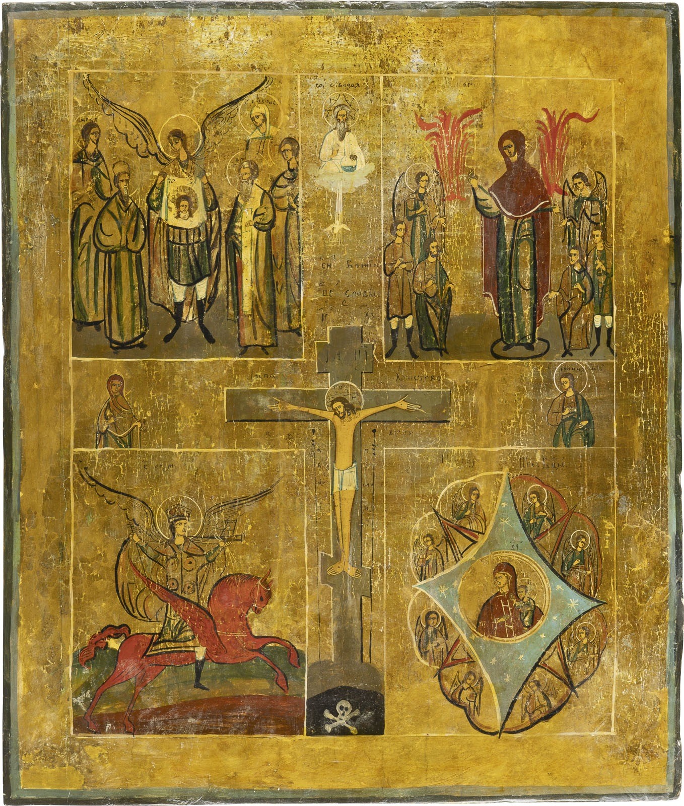 A VERY LARGE QUADRI-PARTITE ICON SHOWING IMAGES OF THE MOTHER OF GOD AND THE ARCHANGEL MICHAEL Russian, 2nd half 19th century Tempera on wood panel. The background made of silver, covered by a golden lacquer. Vertical crack and border restored. 53 x 45.5 cm.