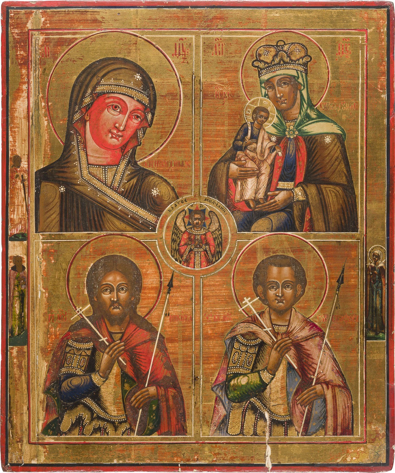 A LARGE QUADRI-PARTITE ICON SHOWING IMAGES OF THE MOTHER OF GOD AND WARRIOR SAINTS Russian, Vetka, 19th century Tempera on wood panel. Painted with bright colours on gold ground. Three selected saints on the borders. Minor vertical crack, minor losses, minor areas of retouching. 44.5 x 37.3 cm.