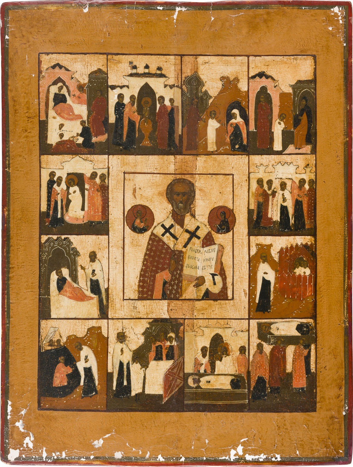A VERY LARGE VITA ICON OF ST. NICHOLAS OF MYRA Russian, 18th century Tempera on wood panel. The lower border and vertical crack restored, losses, the background stripped to gesso. 47 x 36.3 cm.