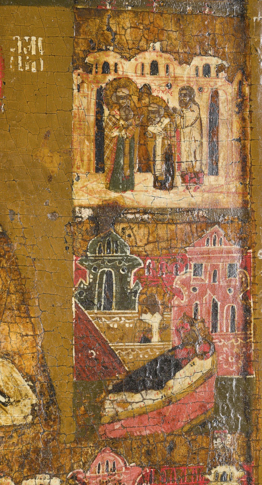A VERY LARGE VITA ICON OF ST. NICHOLAS OF MYRA Russian, circa 1600 Tempera on wood panel with double kovcheg. The entire composition rendered in great detail on ochre ground. Losses, partially restored. 44.9 x 39.3 cm.