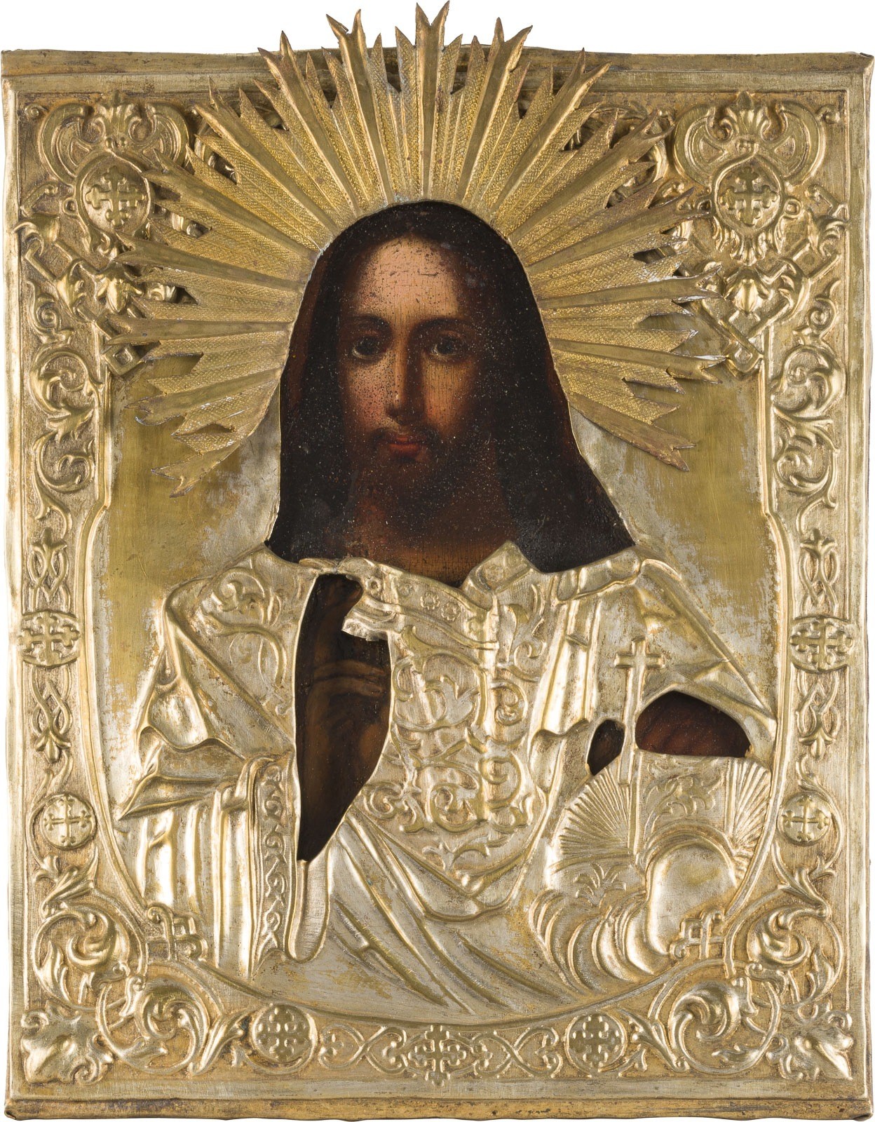 AN ICON SHOWING CHRIST THE SAVIOUR WITH OKLAD Russian, mid 19th century Oil on wood panel with fabric backing. The brass oklad decorated with hammered strapwork borders. Partially restored. 27 x 21.7 cm.