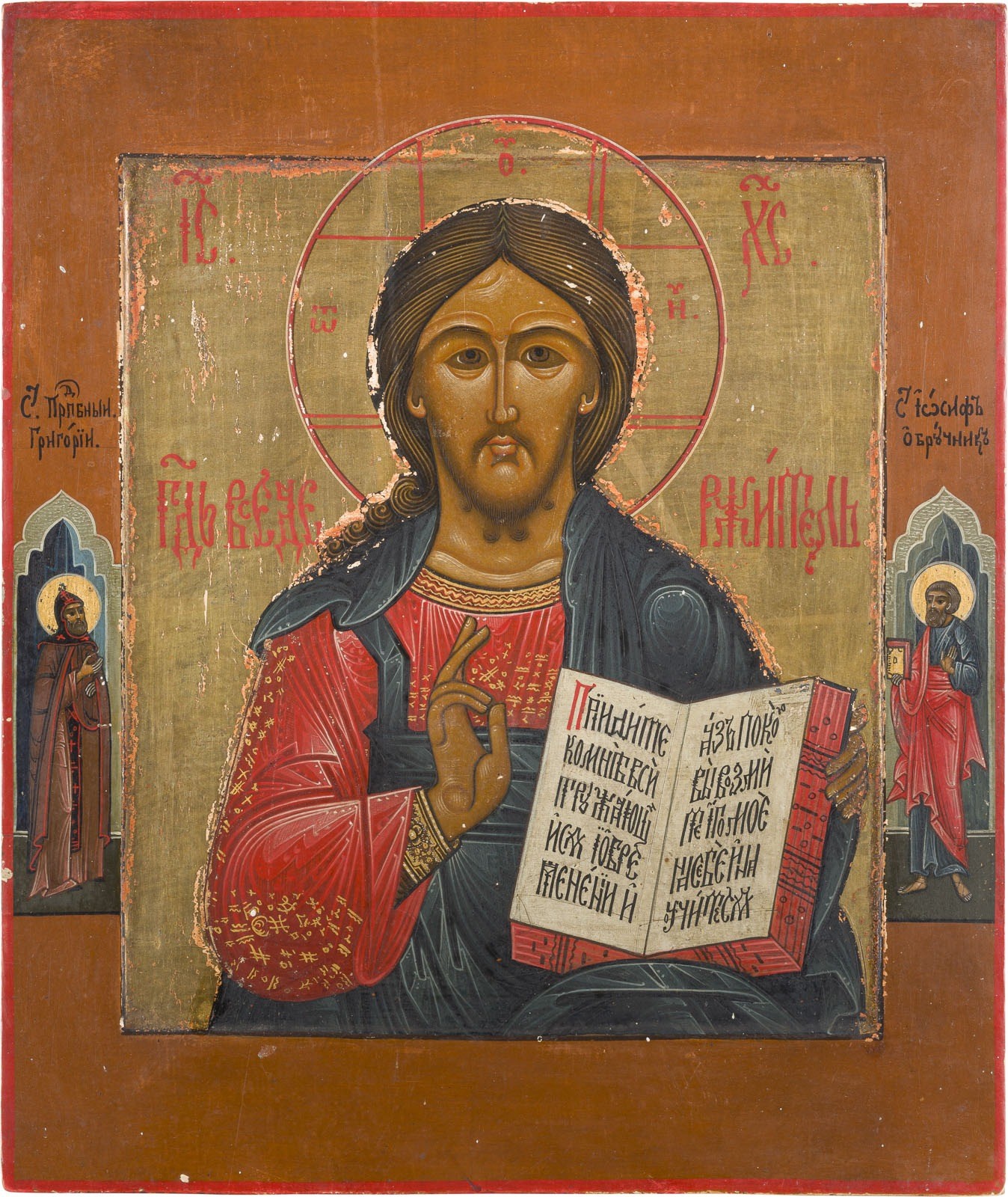 AN ICON SHOWING CHRIST PANTOKRATOR Russian, late 19th century Tempera on wood panel with kovcheg. Finely executed in great detail against a golden background. Two selected saints on the borders. Minor losses. 31 x 26.3 cm.