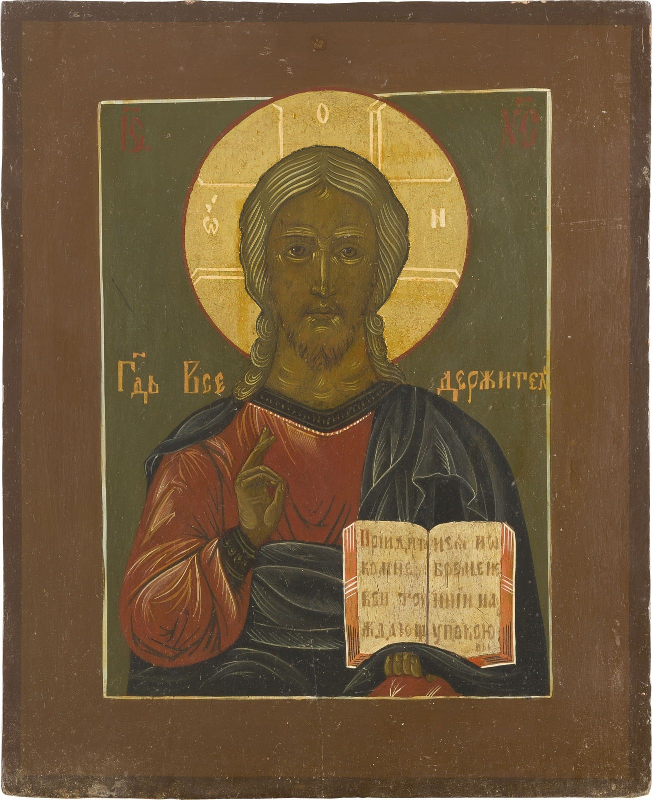 AN ICON SHOWING CHRIST PANTOKRATOR Russian, 19th century Tempera on wood panel. The halo made of gold. Restorations. 35.4 x 29.2 cm.