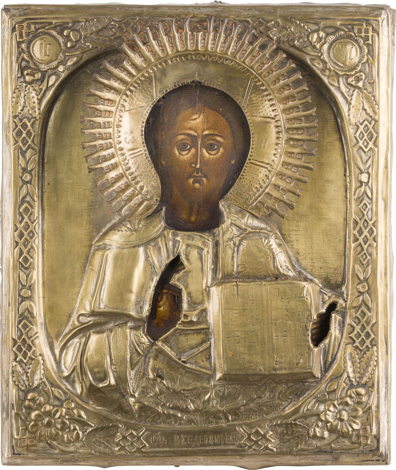 AN ICON SHOWING CHRIST PANTOKRATOR WITH OKLAD Russian, 19th century Tempera on wood panel. Overlaid with a chased brass oklad. Minor damages to the oklad. 31 x 26.3 cm.