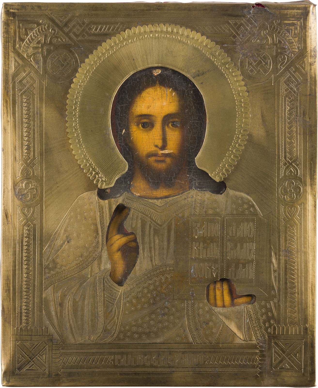 AN ICON SHOWING CHRIST PANTOKRATOR WITH OKLAD Russian, circa 1875 Oil on wood panel with cloth backing. The brass oklad engraved with strapwork. Minor damages to the edges. 26.6 x 22.2 cm.