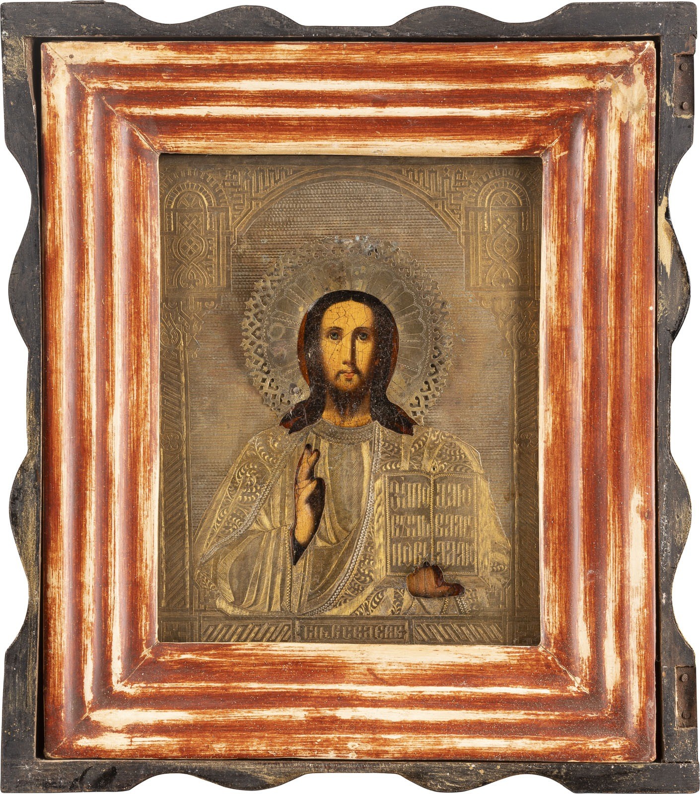 AN ICON SHOWING CHRIST PANTOKRATOR WITH OKLAD WITHIN KYOT Russian, 3rd quarter 19th century Oil on wood panel. Overlaid with an engraved brass oklad. 33.7 x 29.8 cm (with glazed kyot).