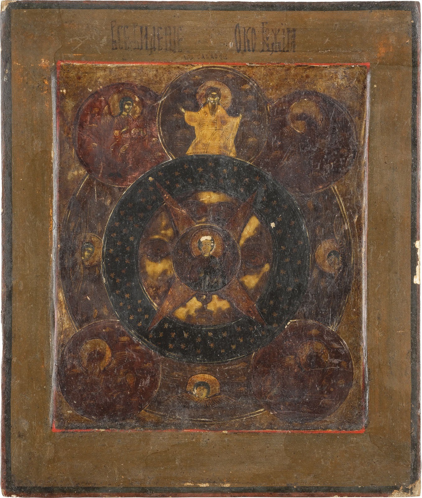 AN ICON SHOWING THE 'ALL-SEEING EYE OF GOD' Russian, 19th century Tempera on wood panel with kovcheg. The haloes made of silver, covered by a golden lacquer. Minor losses, the surface is dirty. 30.9 x 26.1 cm.