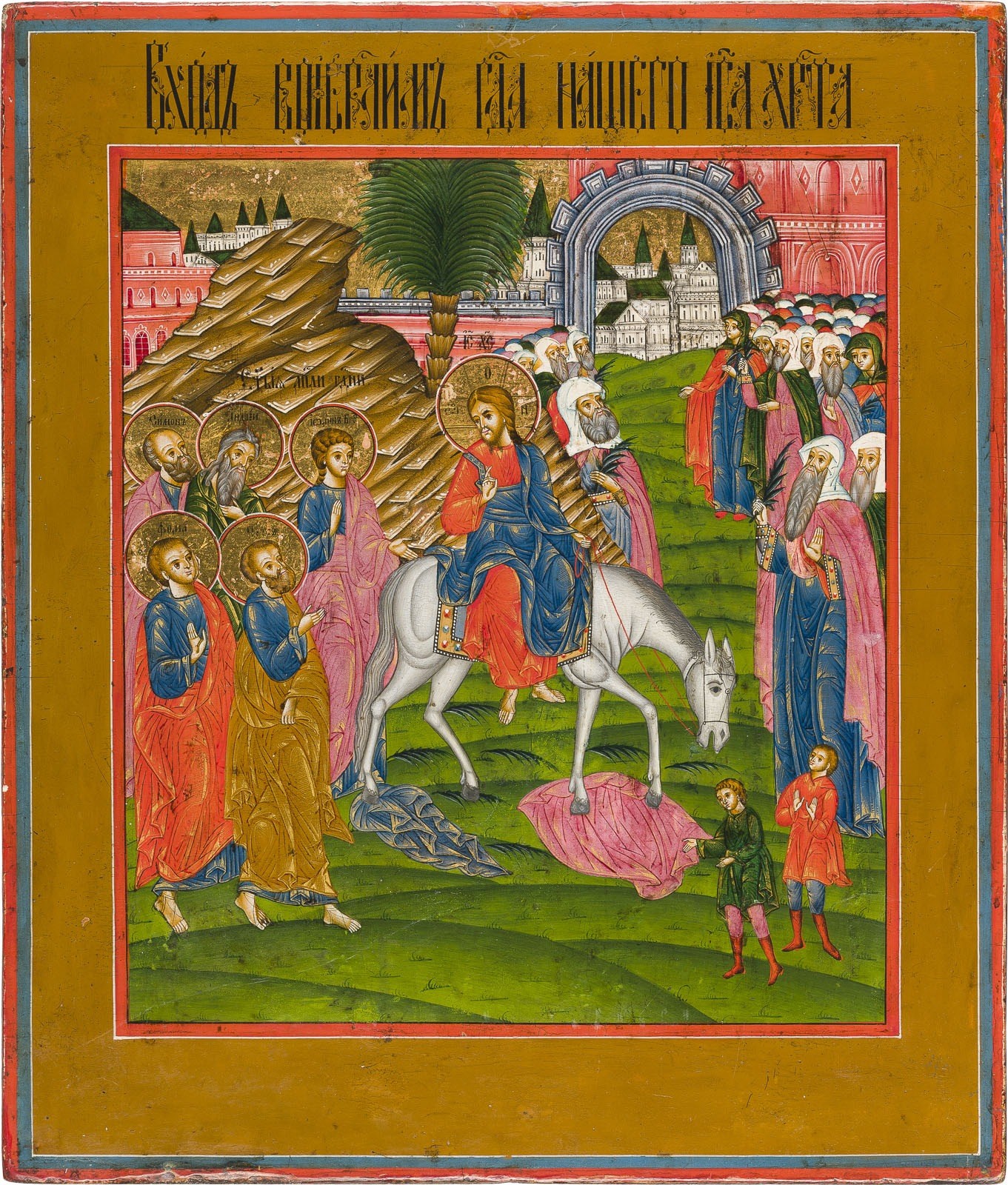 AN ICON SHOWING THE ENTRY INTO JERUSALEM Russian, Old Believers' Workshop, 19th century Tempera on wood panel with kovcheg. The haloes and background made of gold. The edges minimally restored. 35.3 x 30.2 cm.