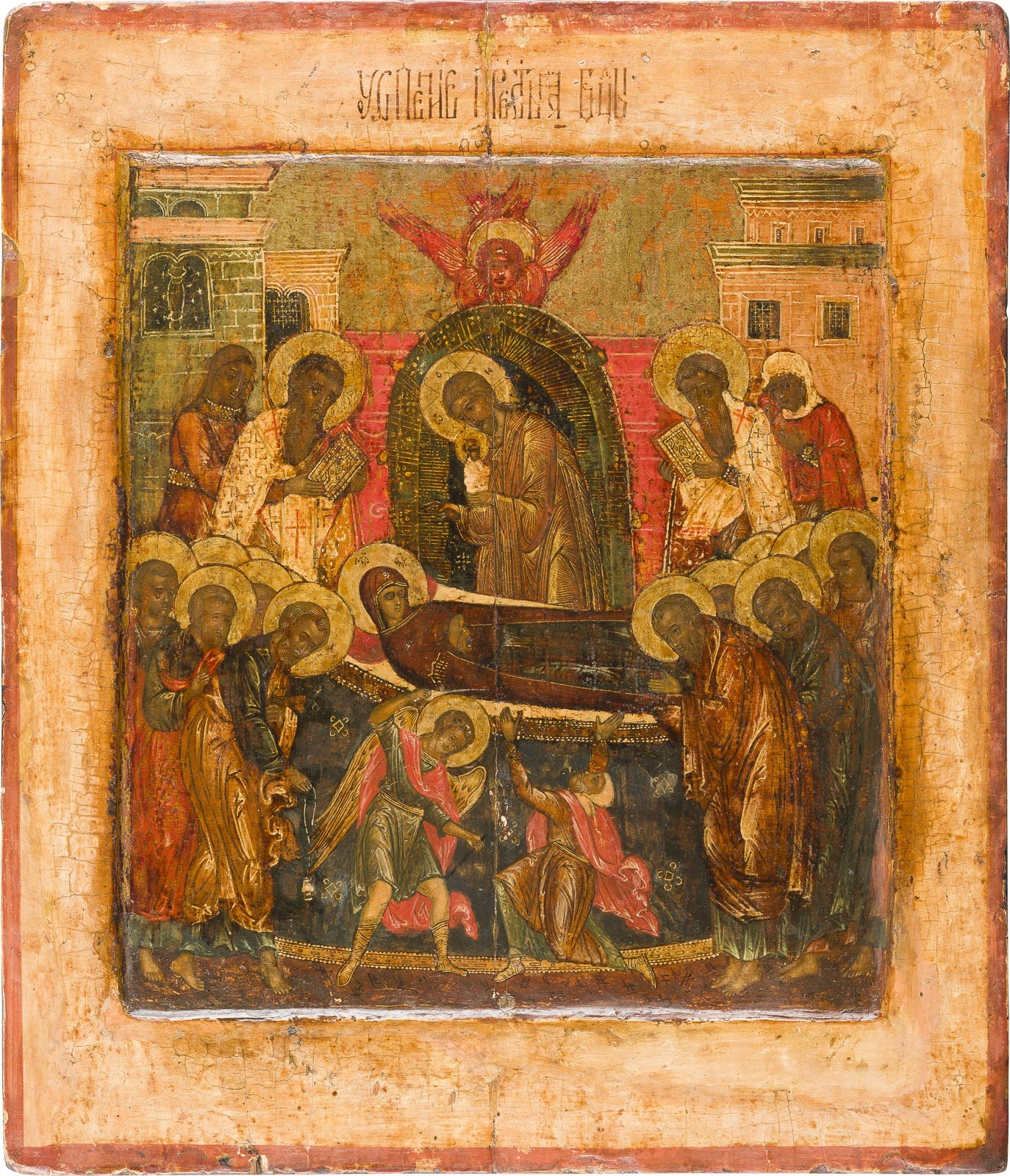 AN ICON SHOWING THE DORMITION OF THE MOTHER OF GOD Russian, 17th century Tempera on wood panel with kovcheg. The haloes made of gold. The border stripped to gesso, vertical crack restored, overpaintings. 31.2 x 26.9 cm.