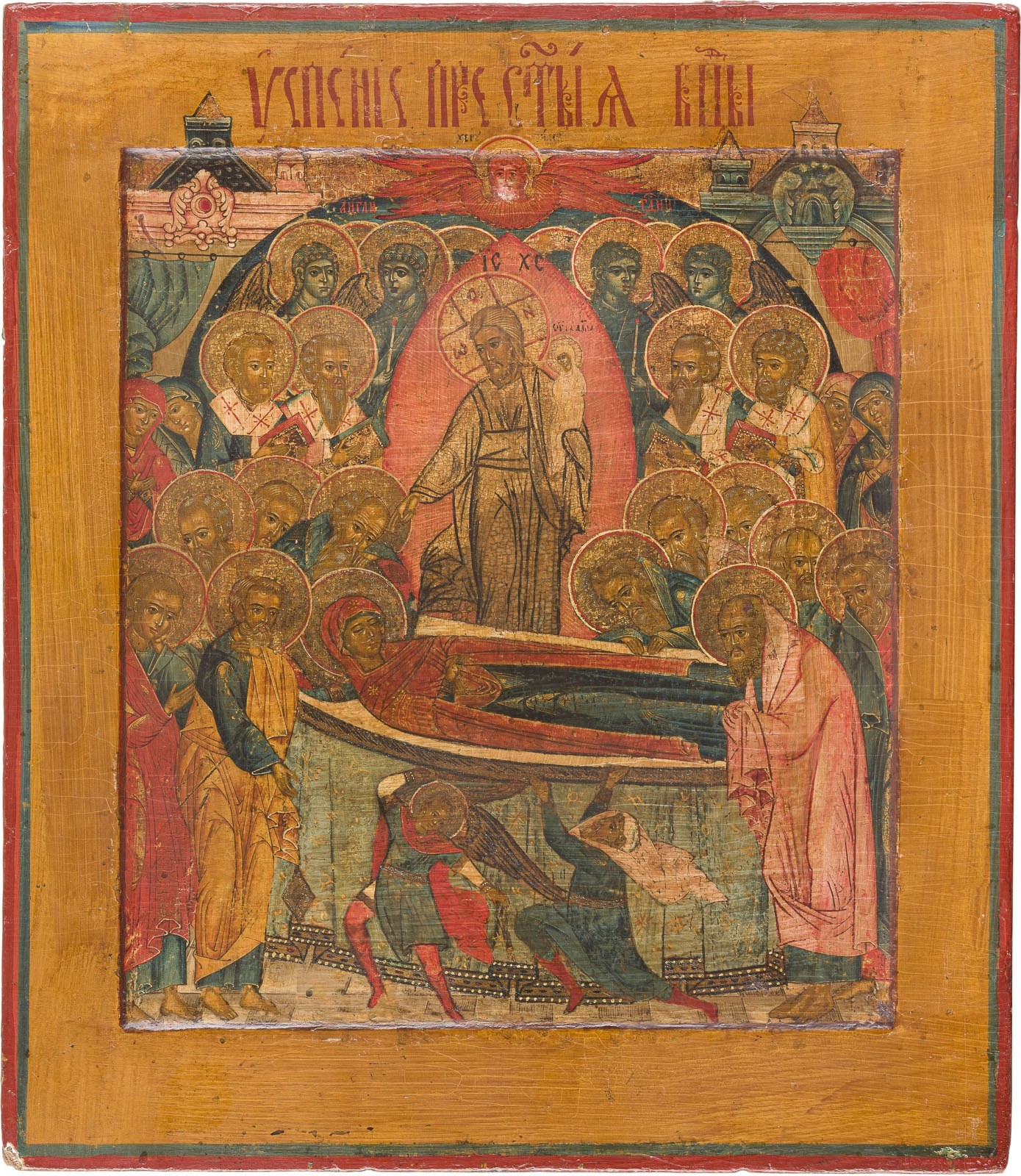 AN ICON SHOWING THE DORMITION OF THE MOTHER OF GOD Russian, circa 1800 Tempera on wood panel with kovcheg. The haloes and background made of gold. Partially restored. 35.5 x 30.7 cm.