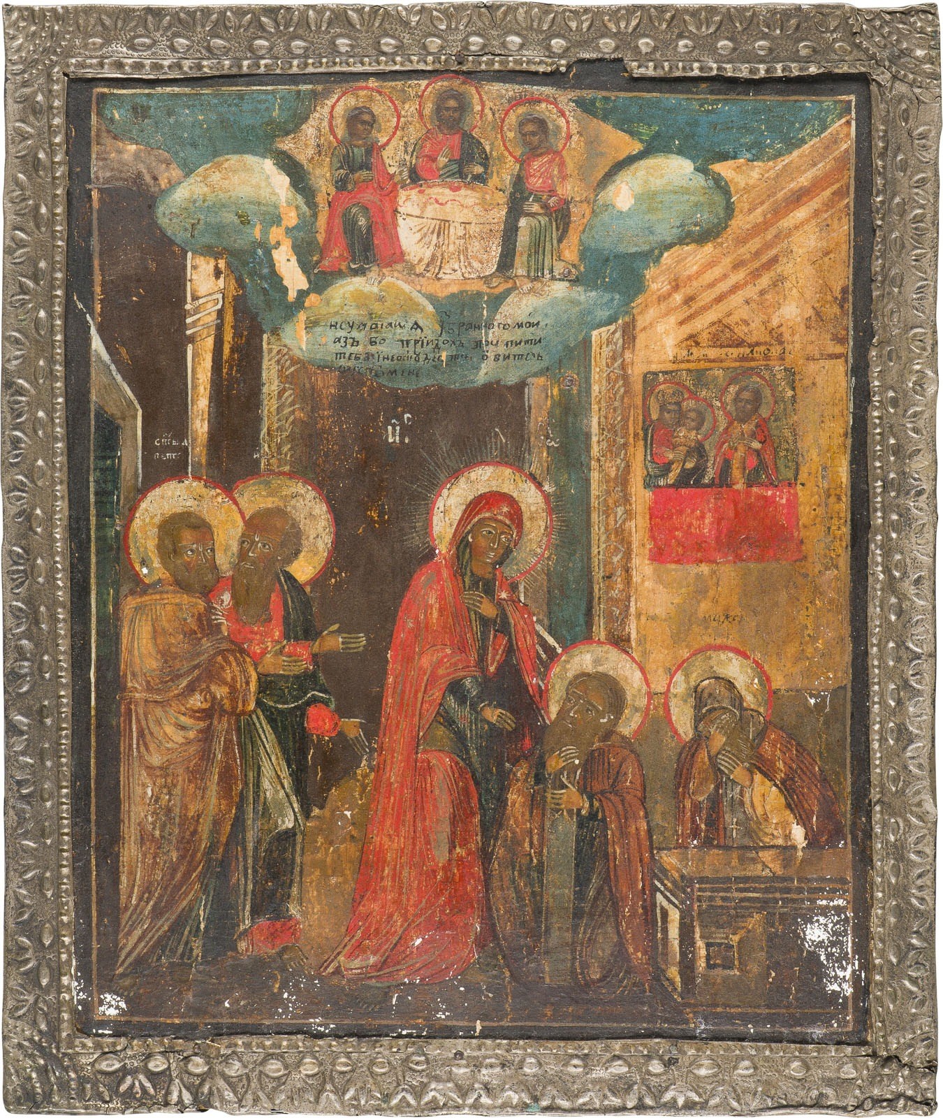 AN ICON OF THE APPEARANCE OF THE MOTHER OF GOD TO SAINT SERGIUS OF RADONEZH WITH BASMA Russian, mid-18th century (icon) Tempera on wood panel with metal basma. Losses, restored. 31 x 26 cm. Provenance / Expertise: Ikonenmuseum Schloss Autenried bei Günzburg/Donau.