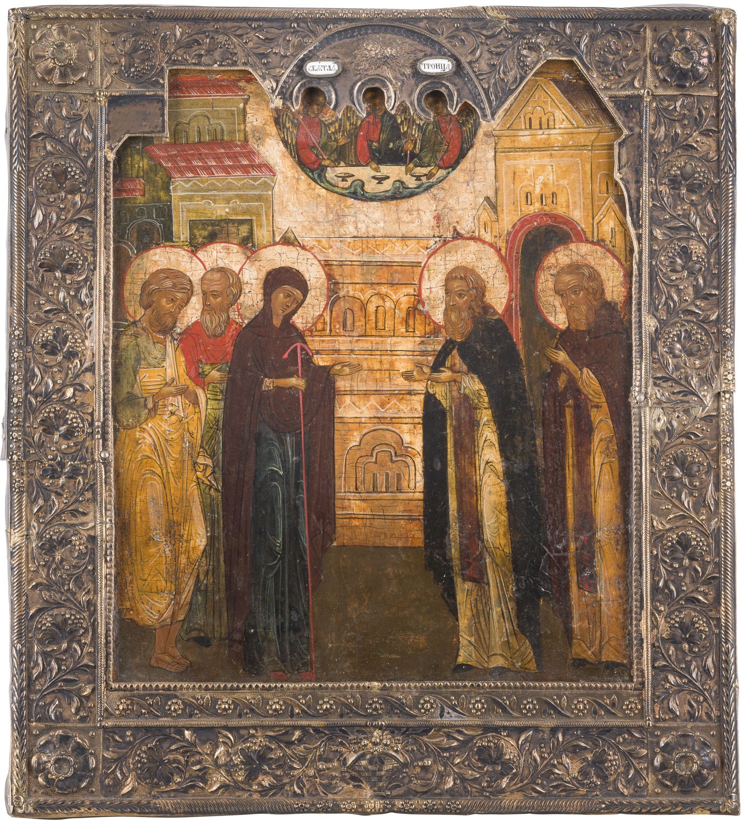 AN ICON SHOWING THE APPEARANCE OF THE MOTHER OF GOD TO ST. SERGEY OF RADONEZH WITH A SILVER-GILT BASMA Russian, 16th century (icon), Russian, Moscow, 1833 (basma) Tempera on wood panel with kovcheg. The borders overlaid with a finely chased silver-gilt basma, set with enamel plaques. Marked with city hallmark, assayer's mark, 84 standard and master's mark 'FV' in Cyrillic. Restorations. 28.5 x 26.6 cm.