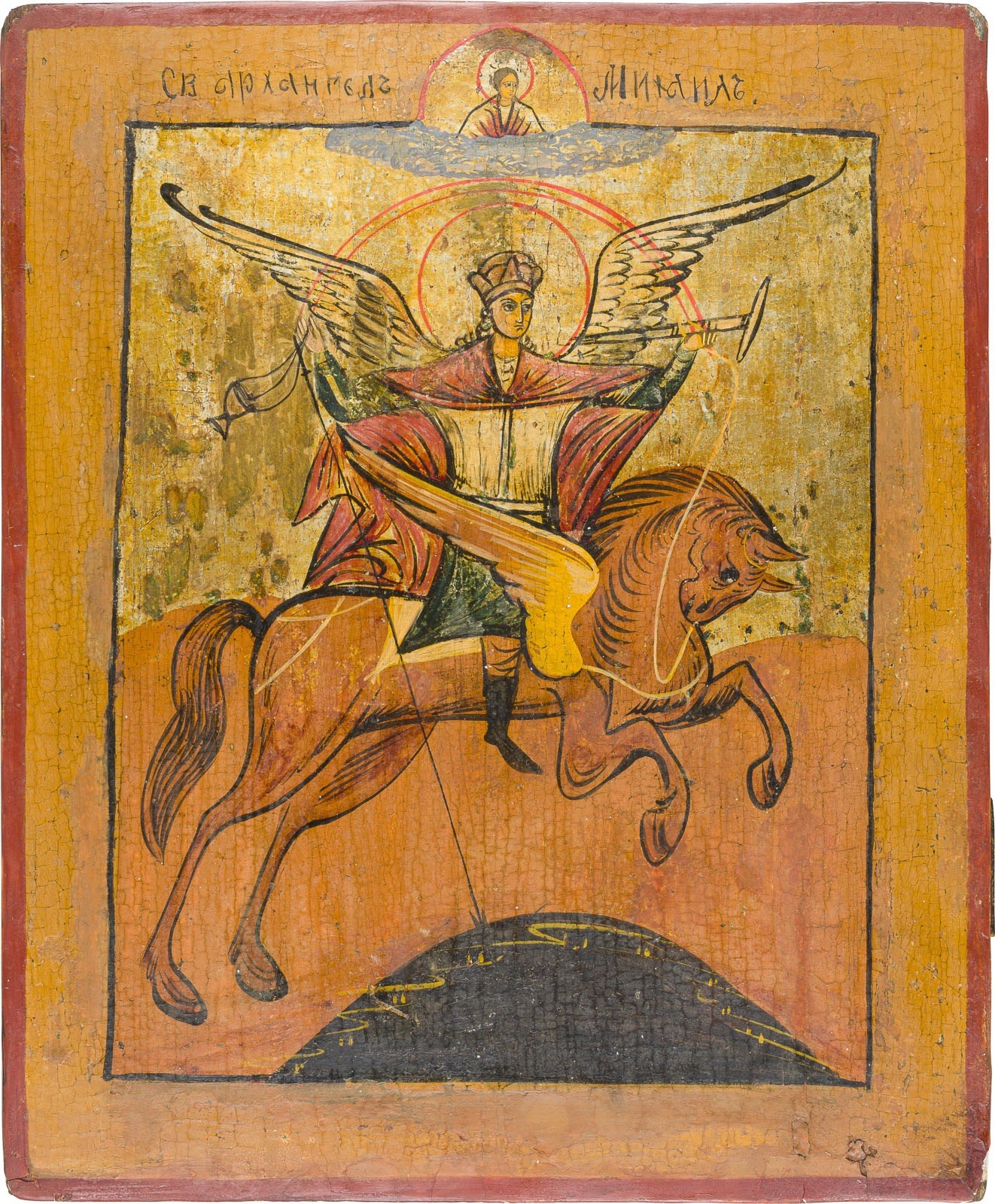 AN ICON SHOWING THE ARCHANGEL MICHAEL AS HORSEMAN OF THE APOCALYPSE Russian, 19th century Tempera on wood panel. The background made of silver, covered by a golden lacquer. Partially restored. 36.3 x 29.7 cm.