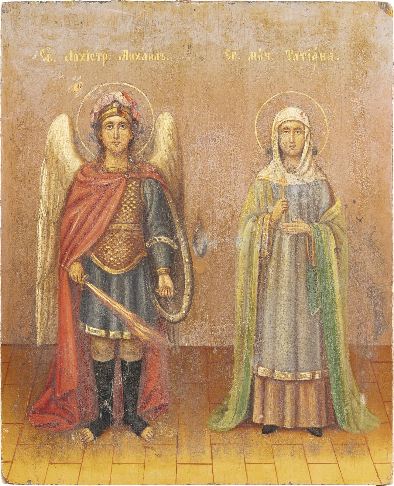 AN ICON SHOWING THE ARCHANGEL MICHAEL AND ST. TATIANA Russian, 2nd half 19th century Oil on wood panel. The edges minimally chipped. 30 x 24.5 cm.