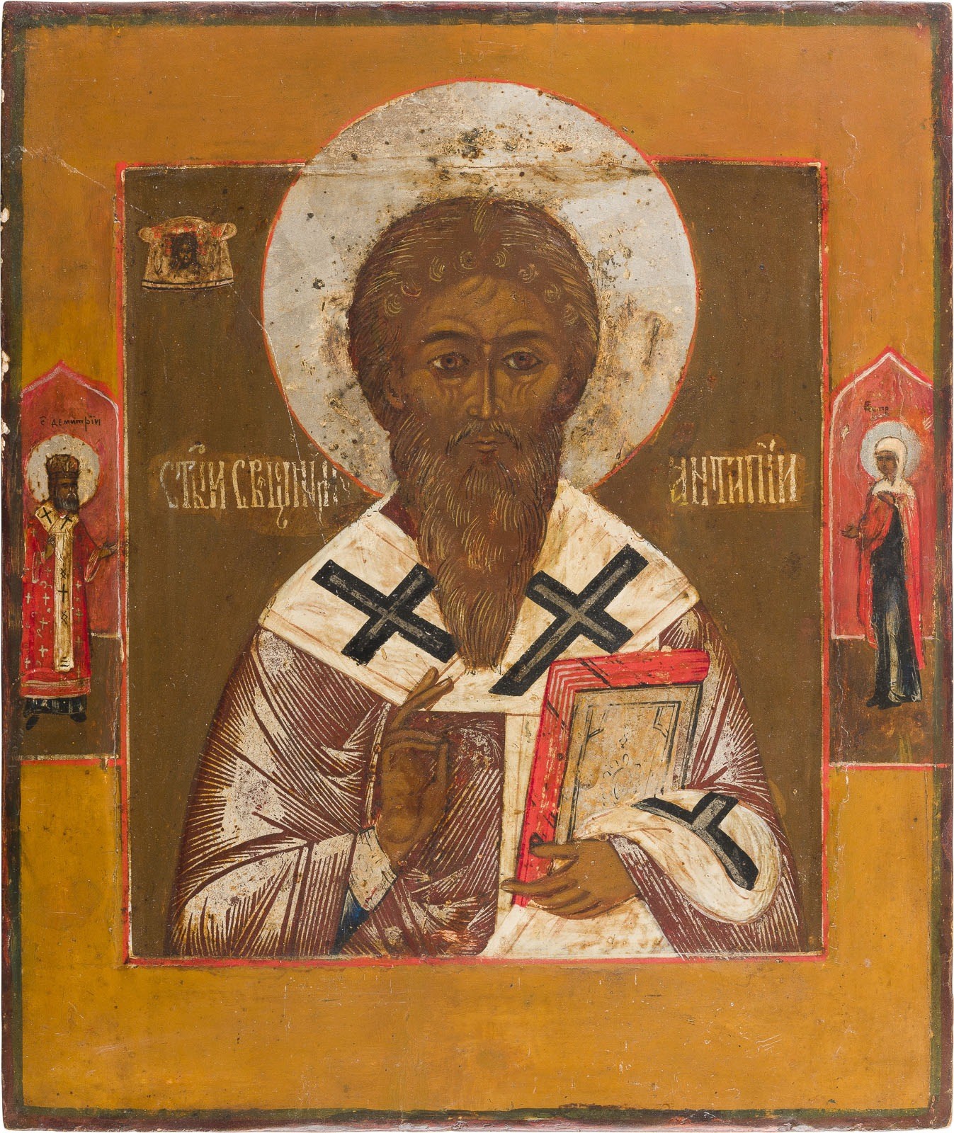 AN ICON SHOWING ST. ANTIPAS Russian, late 18th century Tempera on wood panel with kovcheg. The haloes made of silver. Two selected saints on the borders. Partially restored. 31.2 x 26.4 cm.