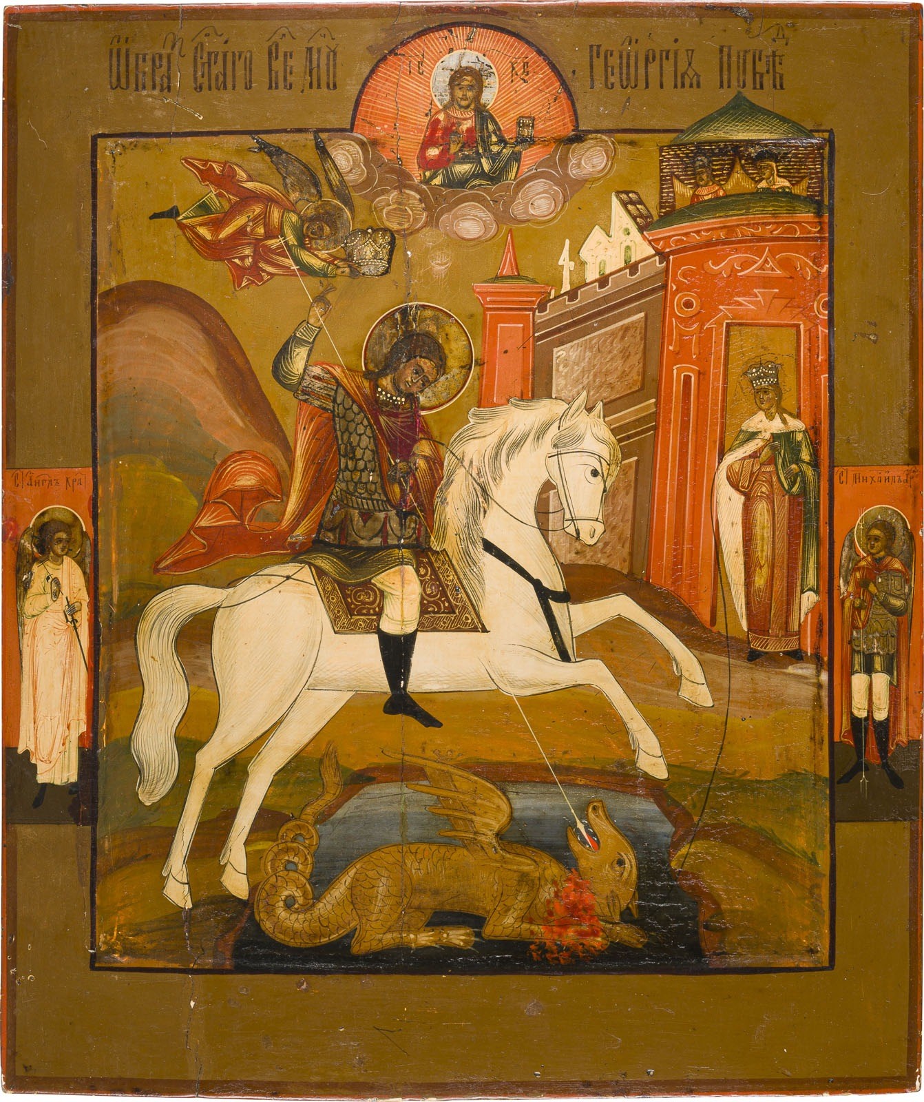 AN ICON OF SAINT GEORGE THE DRAGON SLAYER Russian, 19th century Tempera on wood panel with kovcheg, haloes silvered and glazed in gold. With two saints on the borders: the Guardian Angel and the Archangel Michael. Vertical crack restored. 35.7 x 30.3 cm.