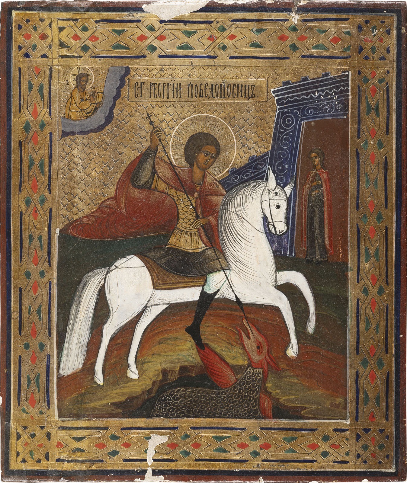 AN ICON SHOWING ST. GEORGE KILLING THE DRAGON Russian, late 19th century Tempera on wood panel. The background made of silver, covered by a golden lacquer. The stylised decoration emulating contemporary metal oklads. Losses, vertical crack restored. 31.1 x 26.5 cm.