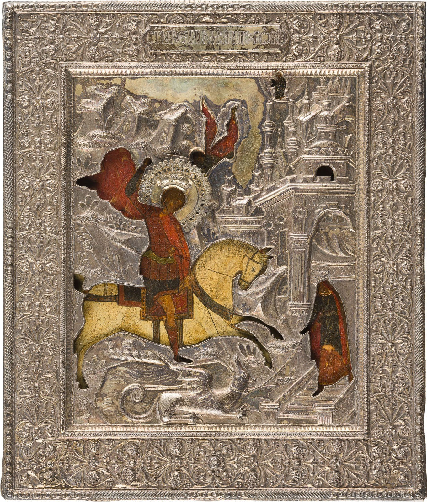 AN ICON SHOWING ST. GEORGE KILLING THE DRAGON WITH A FINE SILVER-GILT RIZA Russian, 19th century (icon), Russian, Moscow, Fedor Timofeev, 1846 (riza) Tempera on wood panel with double kovcheg. The silver-gilt riza repoussé and finely chased, all within a strapwork border cast and chased with foliage. Marked with city hallmark, assayer's mark, 84 standard and master's mark 'FT' in Cyrillic. The background and border stripped to gesso, restorations. 31.1 x 26.2 cm.