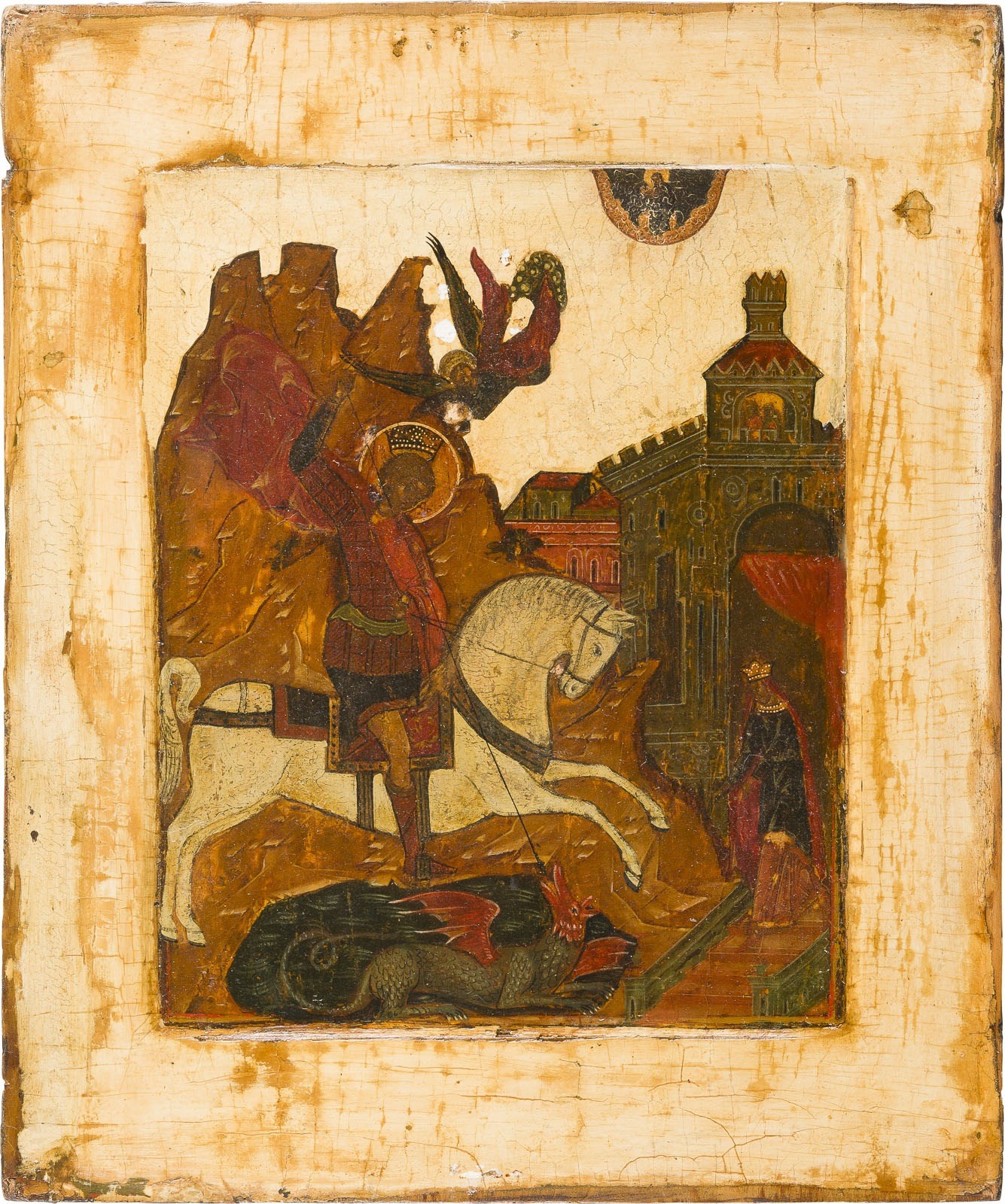 IKONE MIT DEM HEILIGEN GEORG DEM DRACHENTÖTER MIT VERMEIL-RIZA