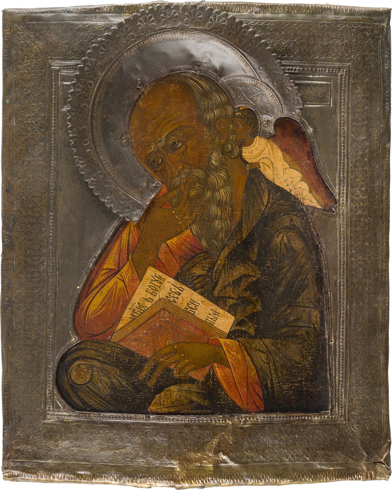 AN ICON SHOWING ST. JOHN THEOLOGIAN IN SILENCE WITH RIZA Russian, 18th century Tempera on wood panel. Overlaid with an ornately incised metal riza. Minimally restored, the lower border later added. 31.5 x 26.8 cm.