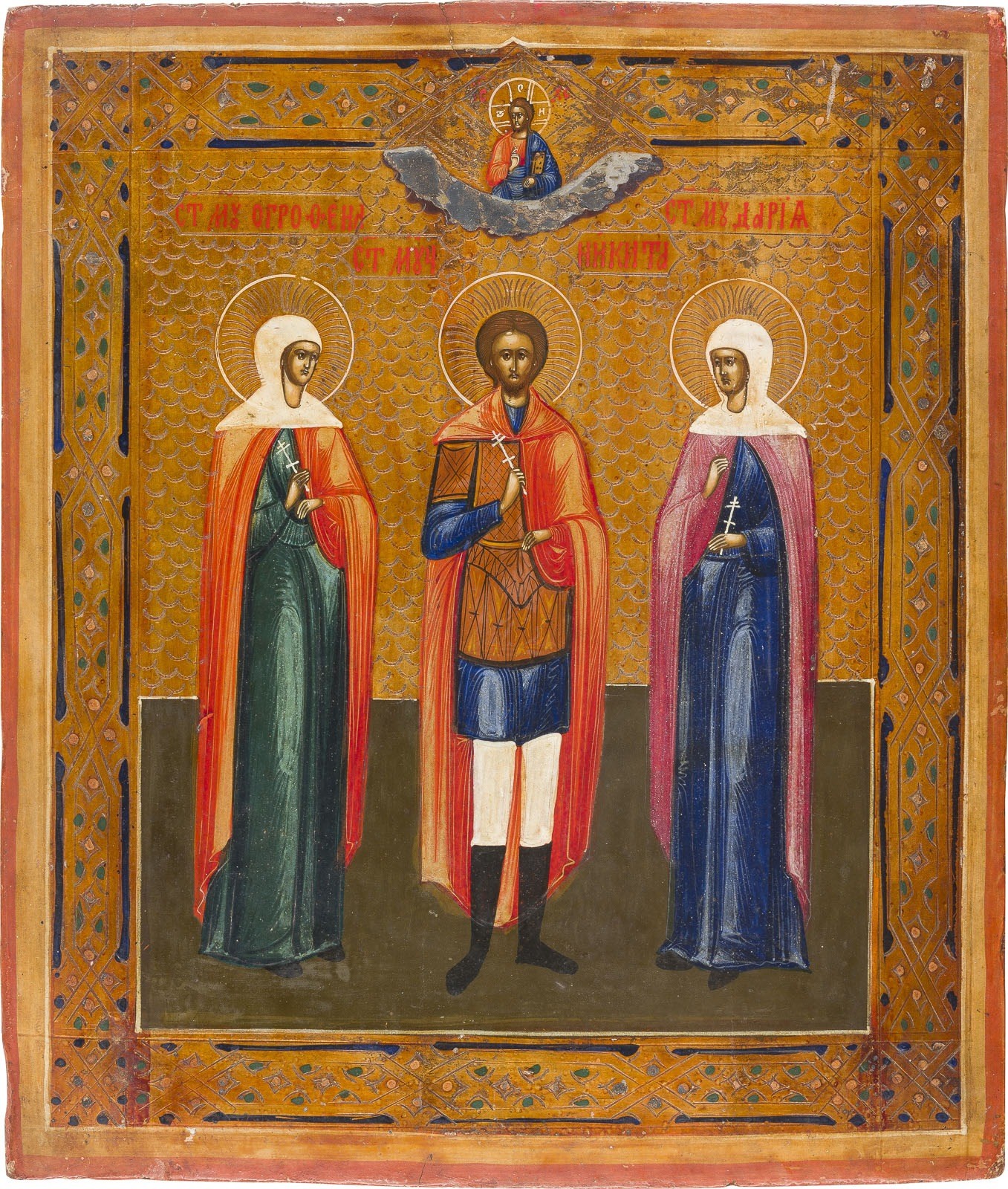 IKONE MIT DEM HEILIGEN NIKITA FLANKIERT VON ZWEI MÄRTYRERINNEN