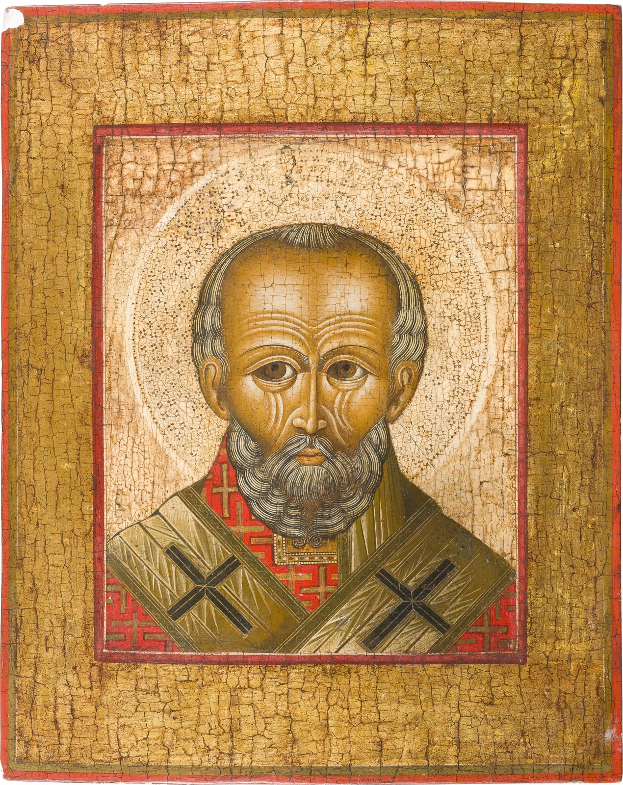 AN ICON SHOWING ST. NICHOLAS THE MIRACLE-WORKER Russian, 19th century Tempera on wood panel with kovcheg. The border made of gold. The background stripped to gesso, partially restored, the edges minimally chipped. 35.5 x 28.7 cm.