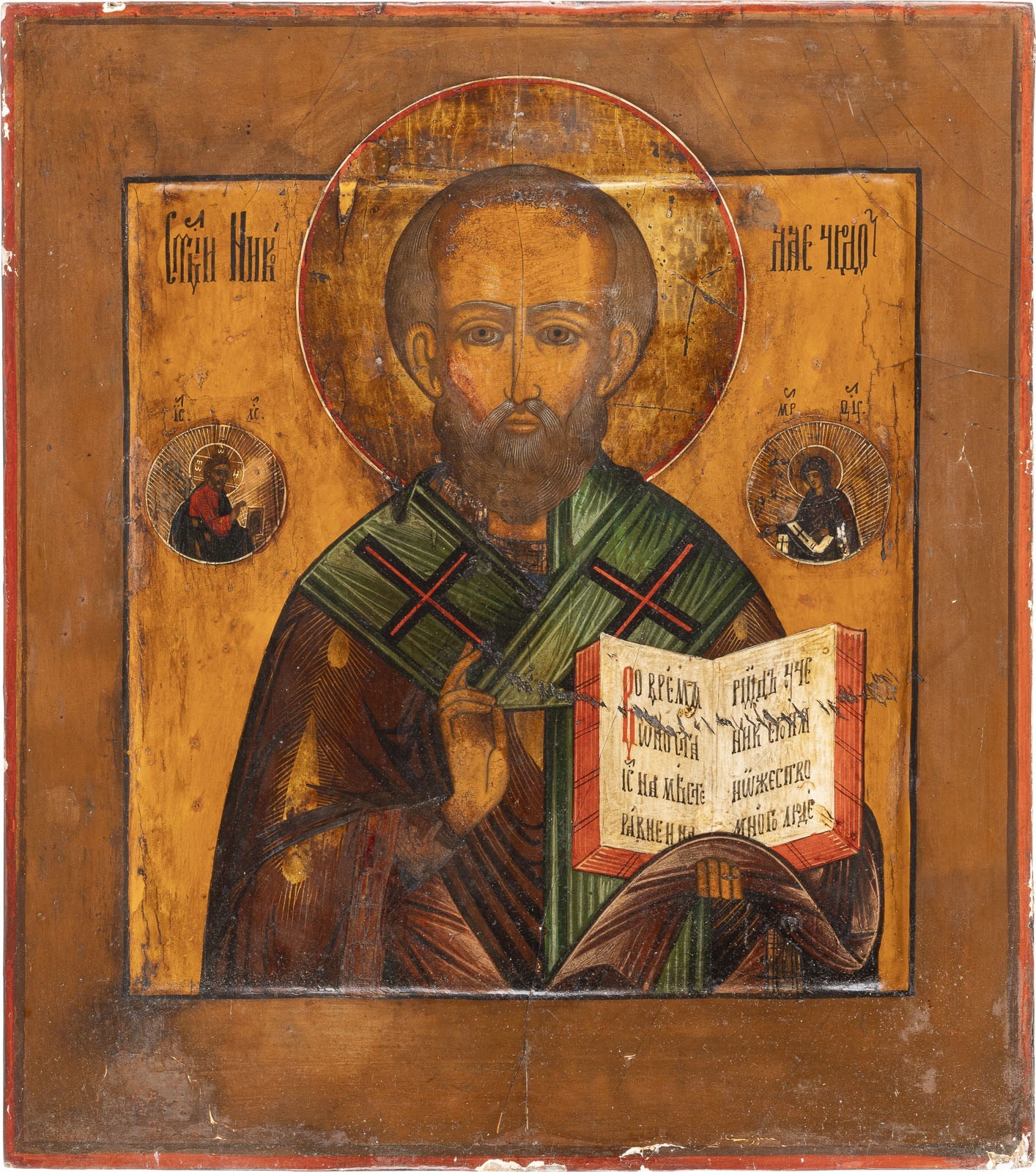 AN ICON SHOWING ST. NICHOLAS THE MIRACLEWORKER Russian, 19th century Tempera on wood panel with kovcheg. The halo made of silver, covered by a golden lacquer. The edges minimally chipped, partially restored. 35.3 x 30.8 cm.