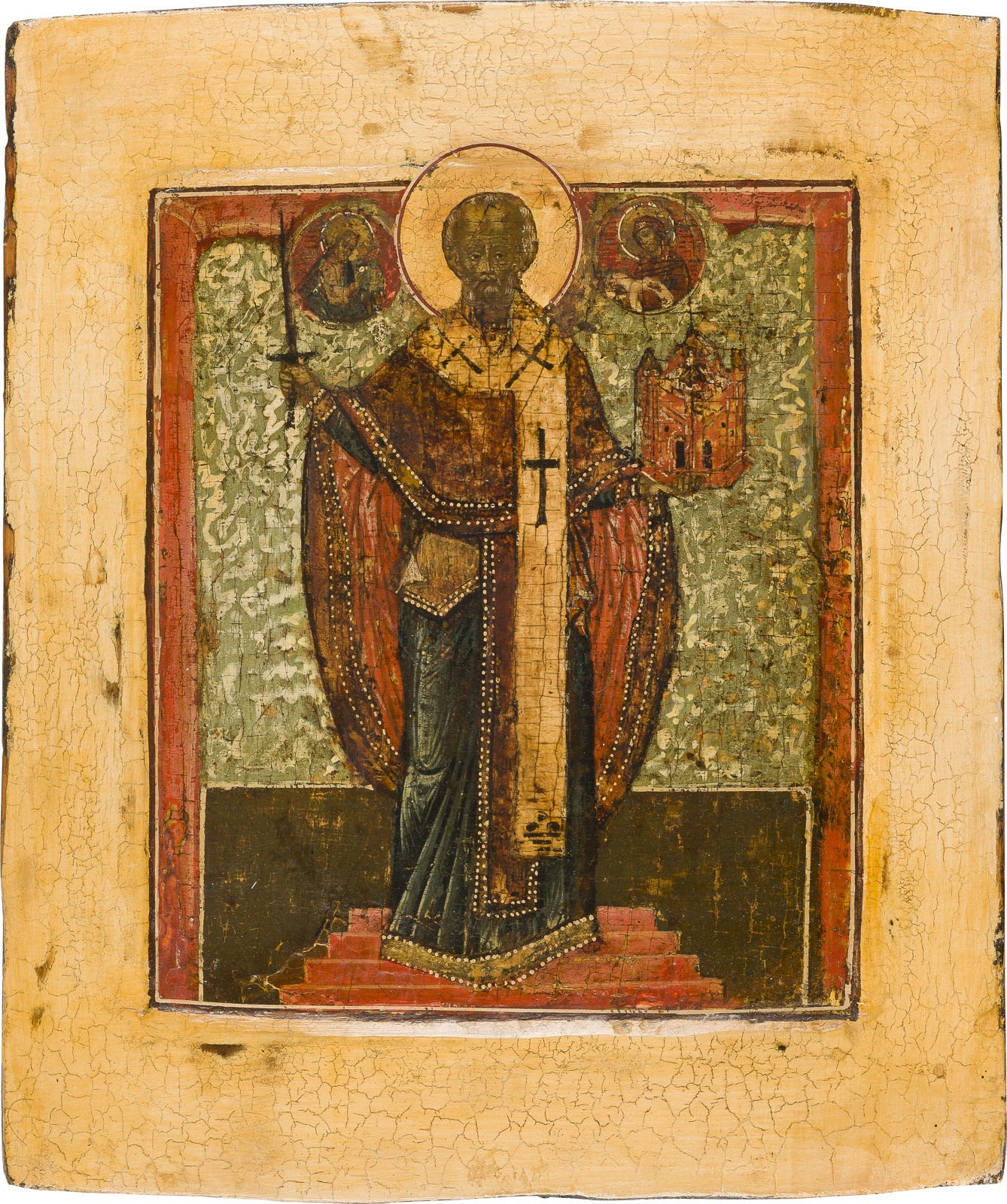 AN ICON SHOWING ST. NICHOLAS OF MOZHAYSK Russian, 17th century Tempera on wood panel with kovcheg. The border stripped to gesso, restorations. 30.5 x 26.9 cm.