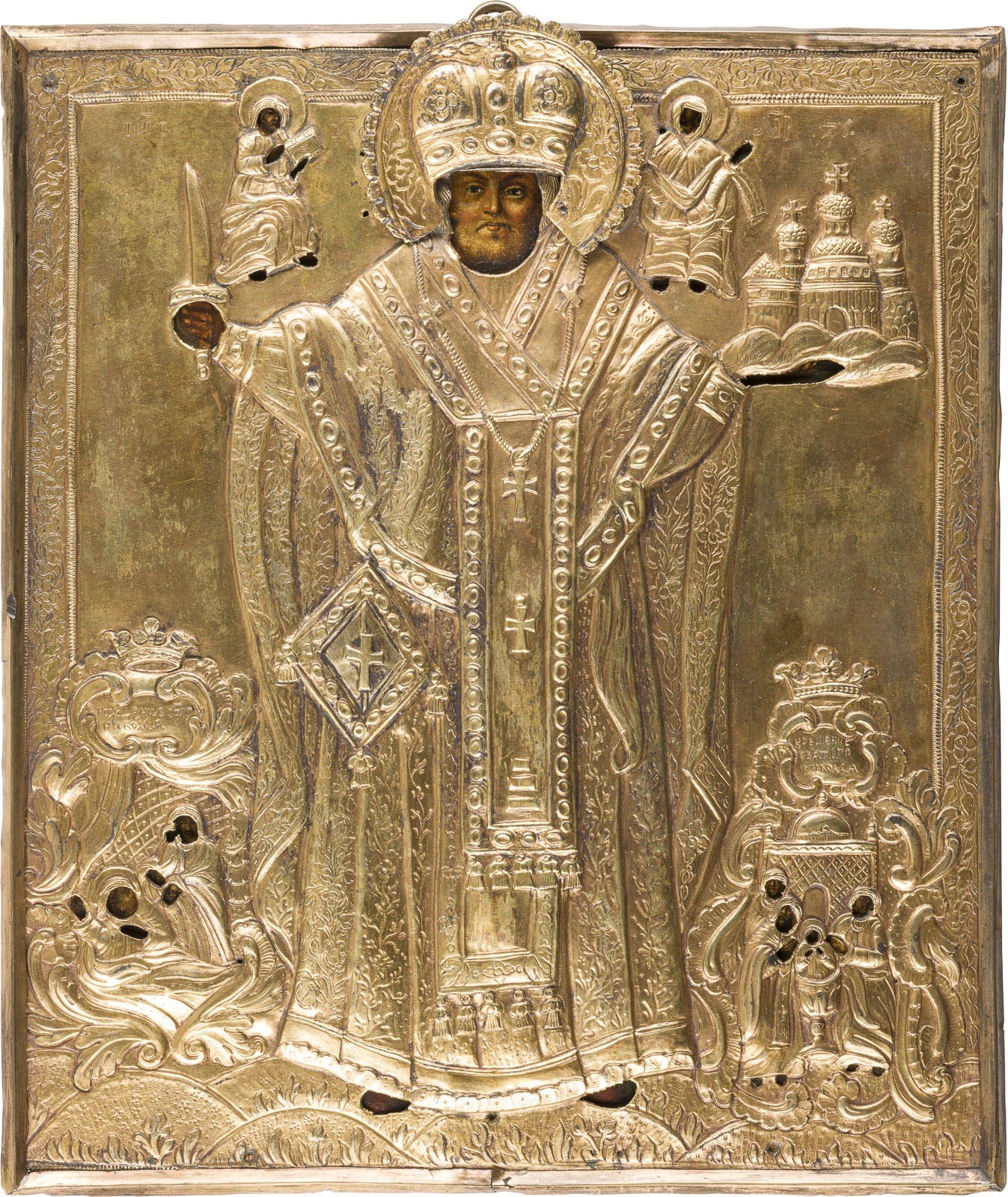 AN ICON SHOWING ST. NICHOLAS OF MOZHAYSK WITH TWO SCENES FROM HIS LIFE WITH OKLAD Russian, 18th century Oil on wood panel. The brass oklad embossed and chased with scrolls. 32.2 x 27.6 cm.