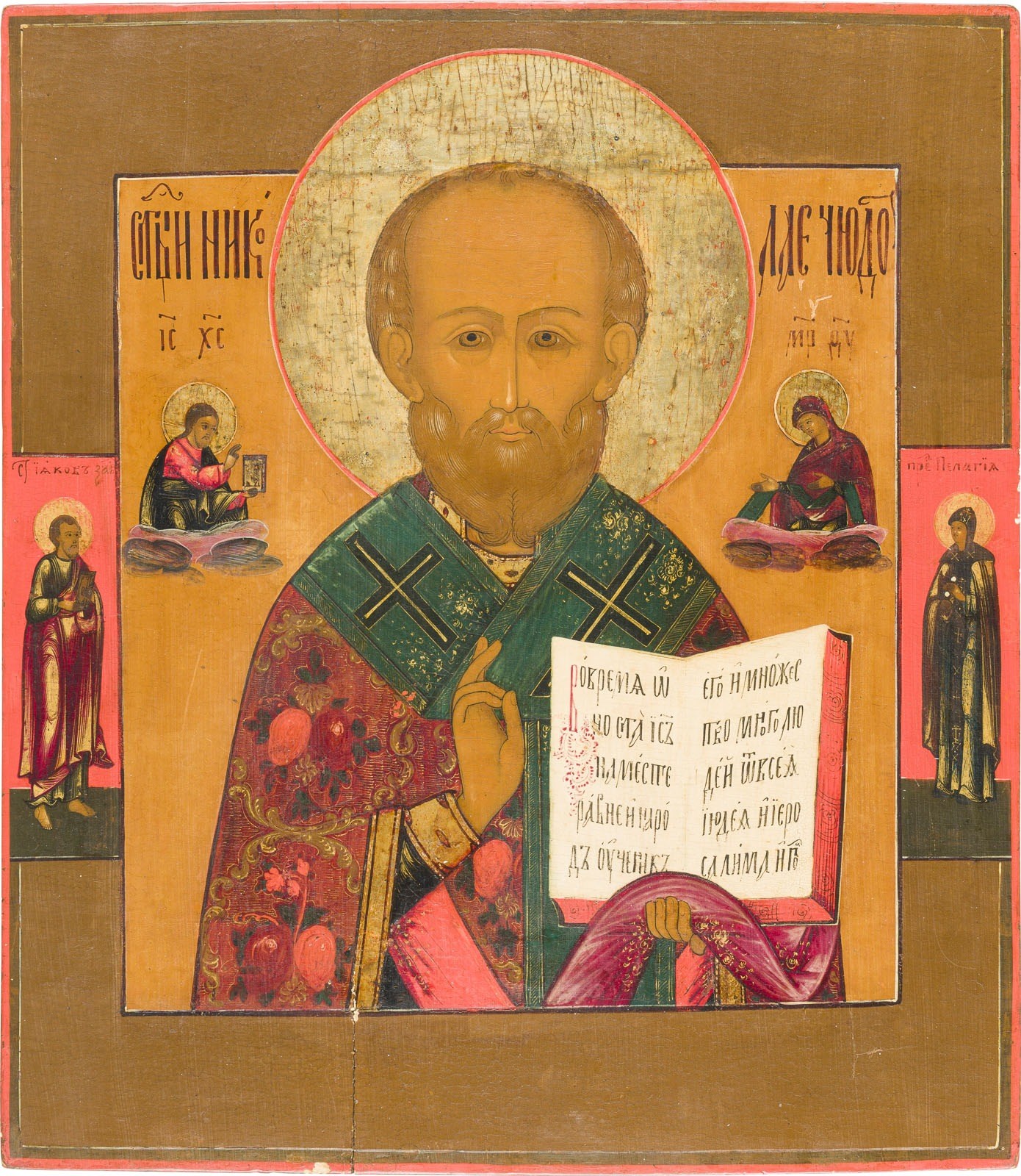 AN ICON SHOWING ST. NICHOLAS OF MYRA Russian, mid-19th century Tempera on wood panel with kovcheg. The haloes made of silver, covered by a golden lacquer. 34.9 x 30.8 cm.