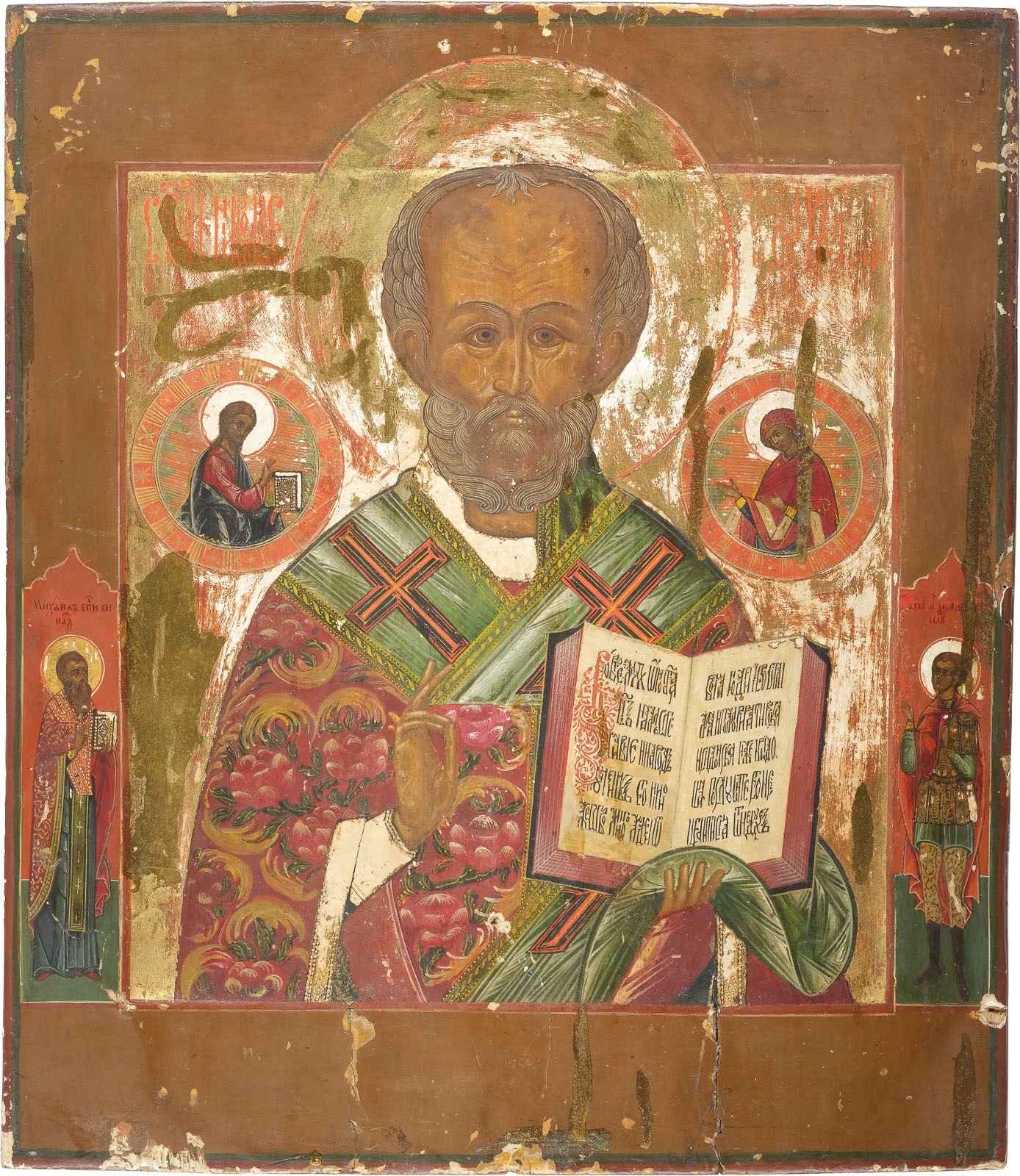 AN ICON SHOWING ST. NICHOLAS OF MYRA Russian, 19th century Tempera on wood panel with kovcheg. The background and halo made of gold. Two selected saints on the borders. Minor vertical crack, wearings. 35.2 x 30.8 cm.