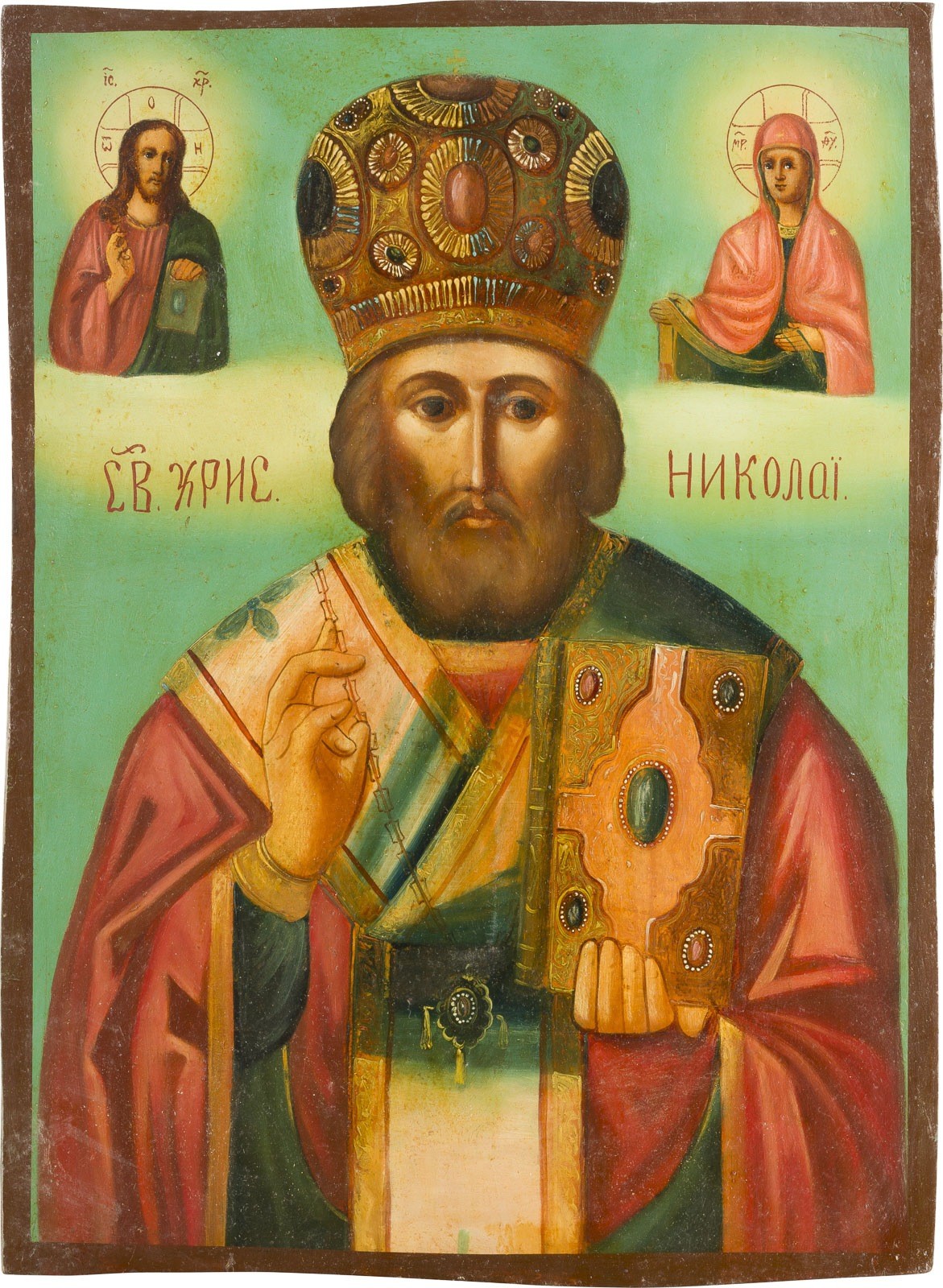 AN ICON SHOWING ST. NICHOLAS OF MYRA Russian, 19th century Oil on wood panel. Minimally restored. 35.7 x 26.2 cm.