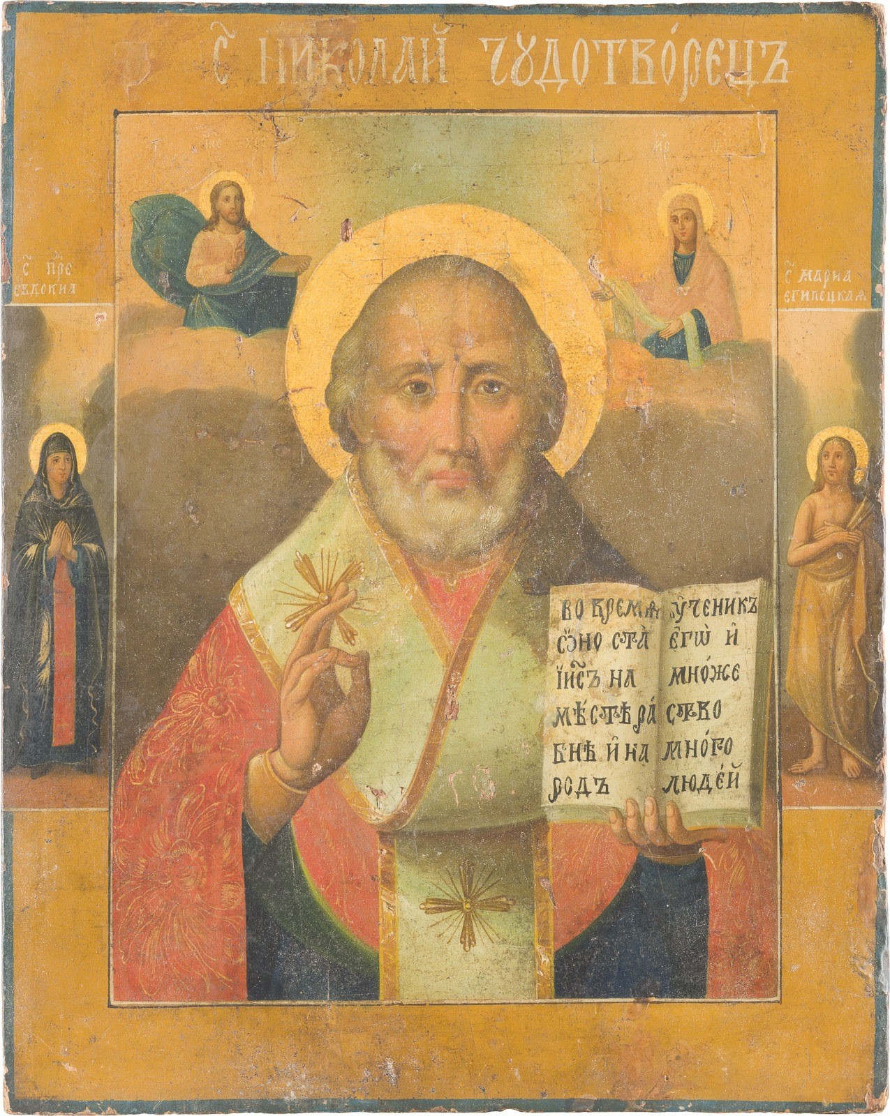 AN ICON SHOWING ST. NICHOLAS OF MYRA Russian, 2nd half 19th century Oil on wood panel. The haloes made of gold. Two selected saints on the borders: Eudokia and St. Mary of Egpyt. The edges partially damaged, Evidence of woodworm to the reverse. 30.8 x 24.8 cm.