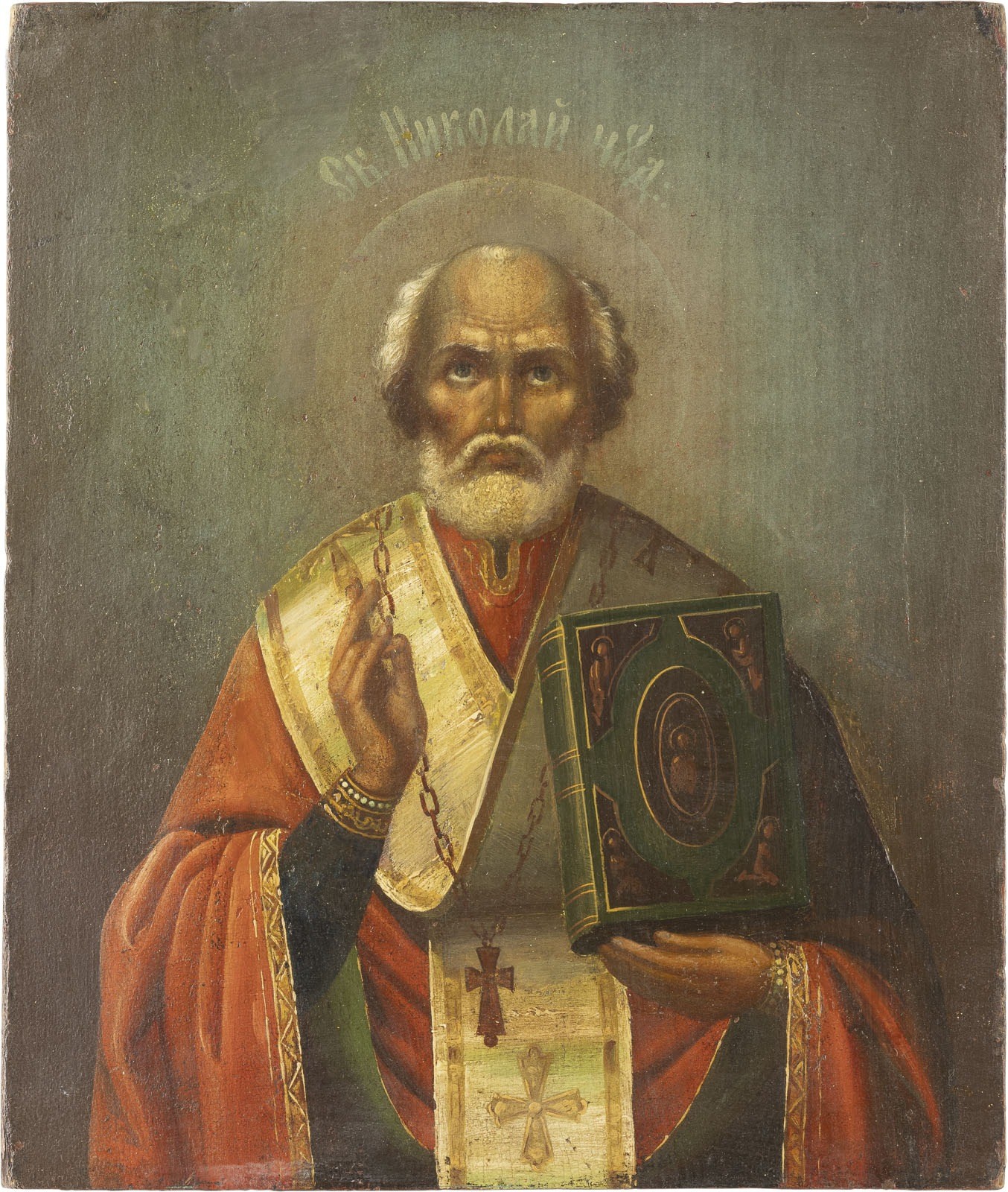 AN ICON SHOWING ST. NICHOLAS OF MYRA Russian, 3rd quarter 19th century Oil on wood panel. Minimally restored. 31 x 26.3 cm.
