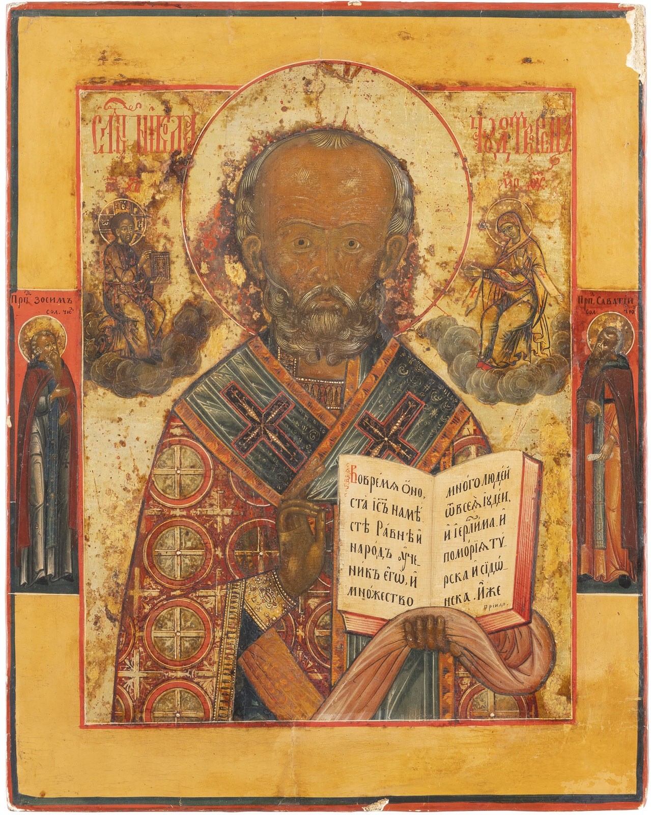AN ICON SHOWING ST. NICHOLAS OF MYRA Russian, late 18th century Tempera on wood panel. Executed on a gold ground. Two selected saints on the borders: Sts. Zosima and Savvatiy. The edges minimally chipped, minimally restored. 31.1 x 24.8 cm.