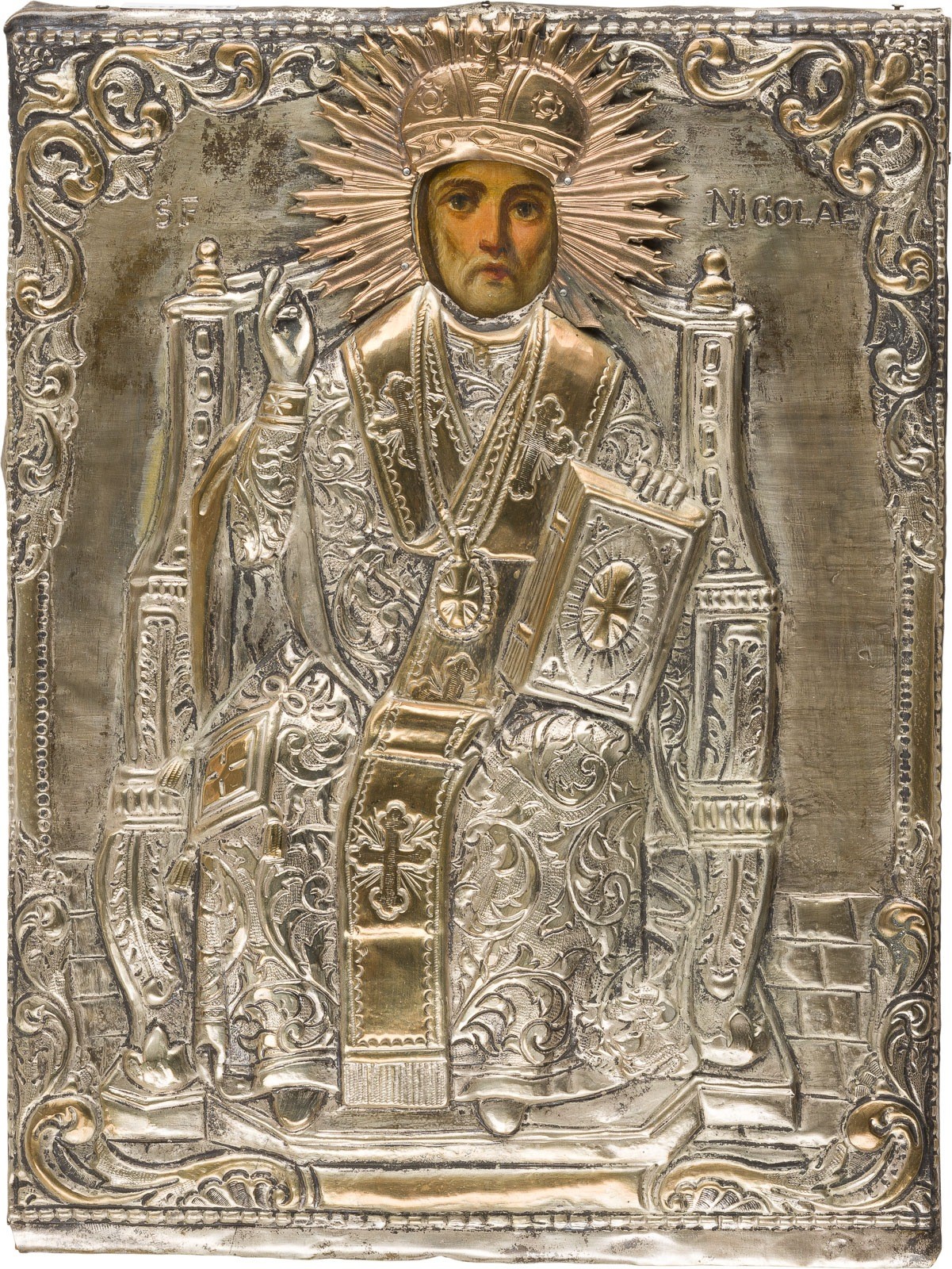 IKONE MIT DEM HEILIGEN NIKOLAUS VON MYRA MIT OKLAD