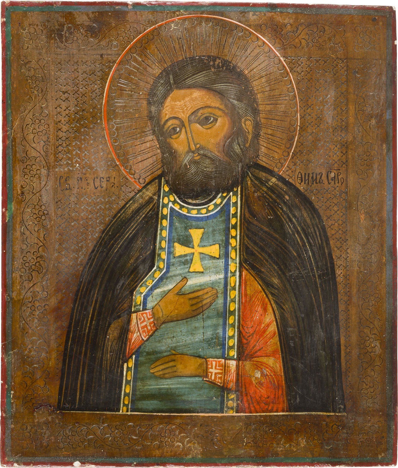 AN ICON SHOWING ST. SERAPHIM OF SAROV Russian, after 1903 Tempera on wood panel. The silvered background ornately punched. Minimally restored. 30.6 x 26.5 cm.