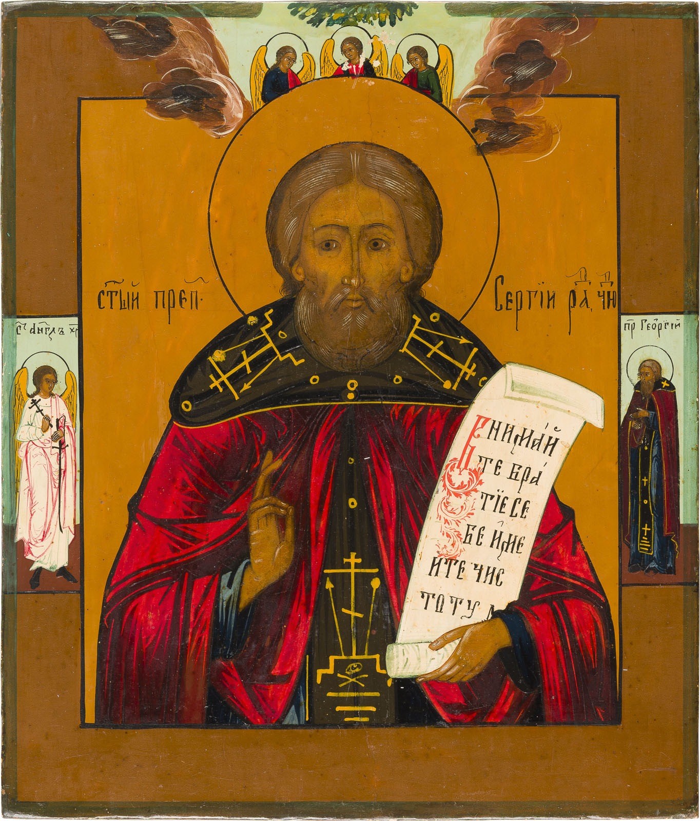 AN ICON SHOWING ST. SERGIUS OF RADONEZH Russian, late 19th century Tempera on wood panel. Two selected saints on the borders: Guardian Angel and St. Georgiy. Minimally restored. 30 x 25.8 cm.