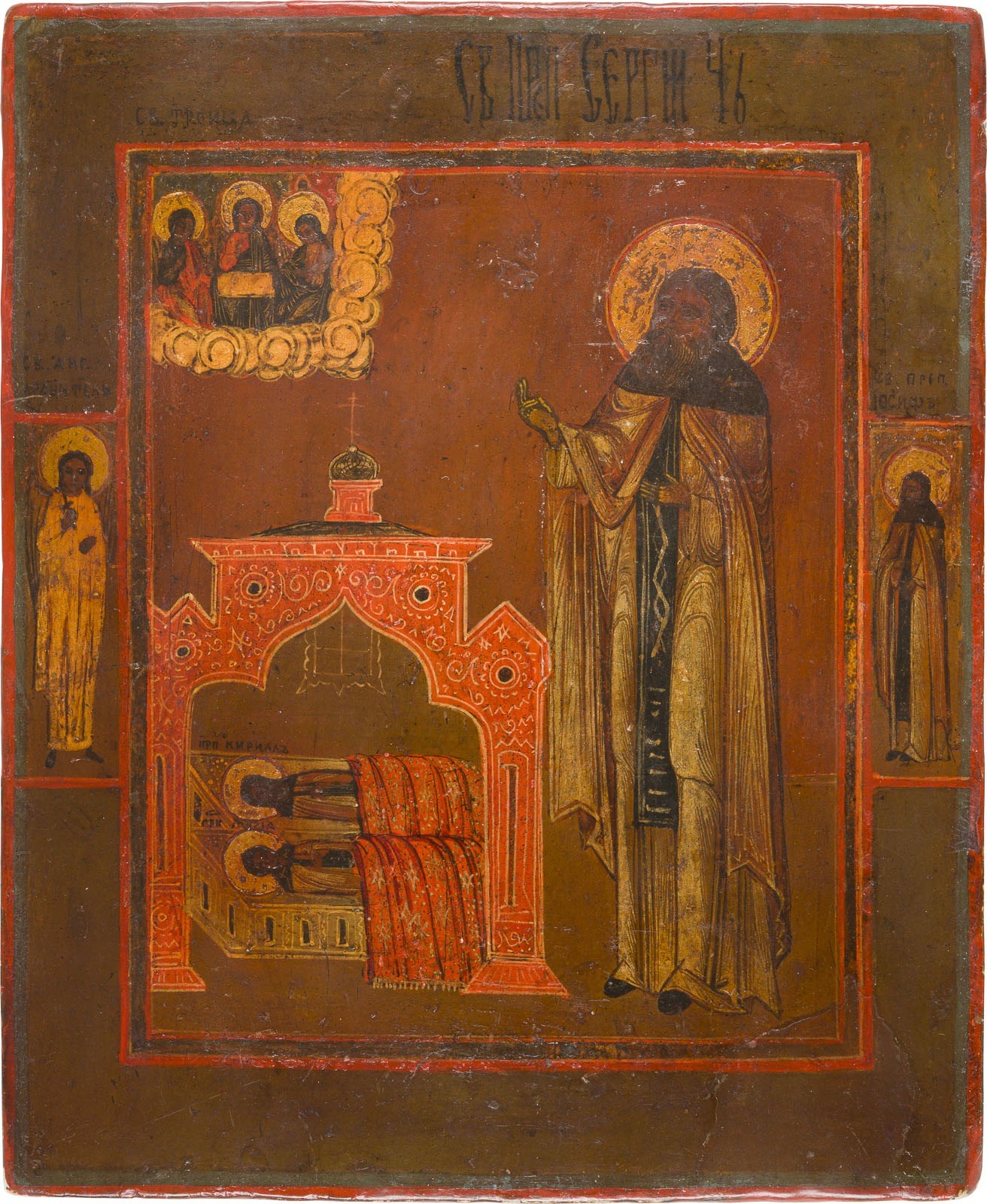 AN ICON OF ST SERGIUS OF RADONEZH AT THE GRAVE OF HIS PARENTS Russian, 19th century Tempera on wood panel, haloes gilt. Restorations. 26.5 x 22 cm.