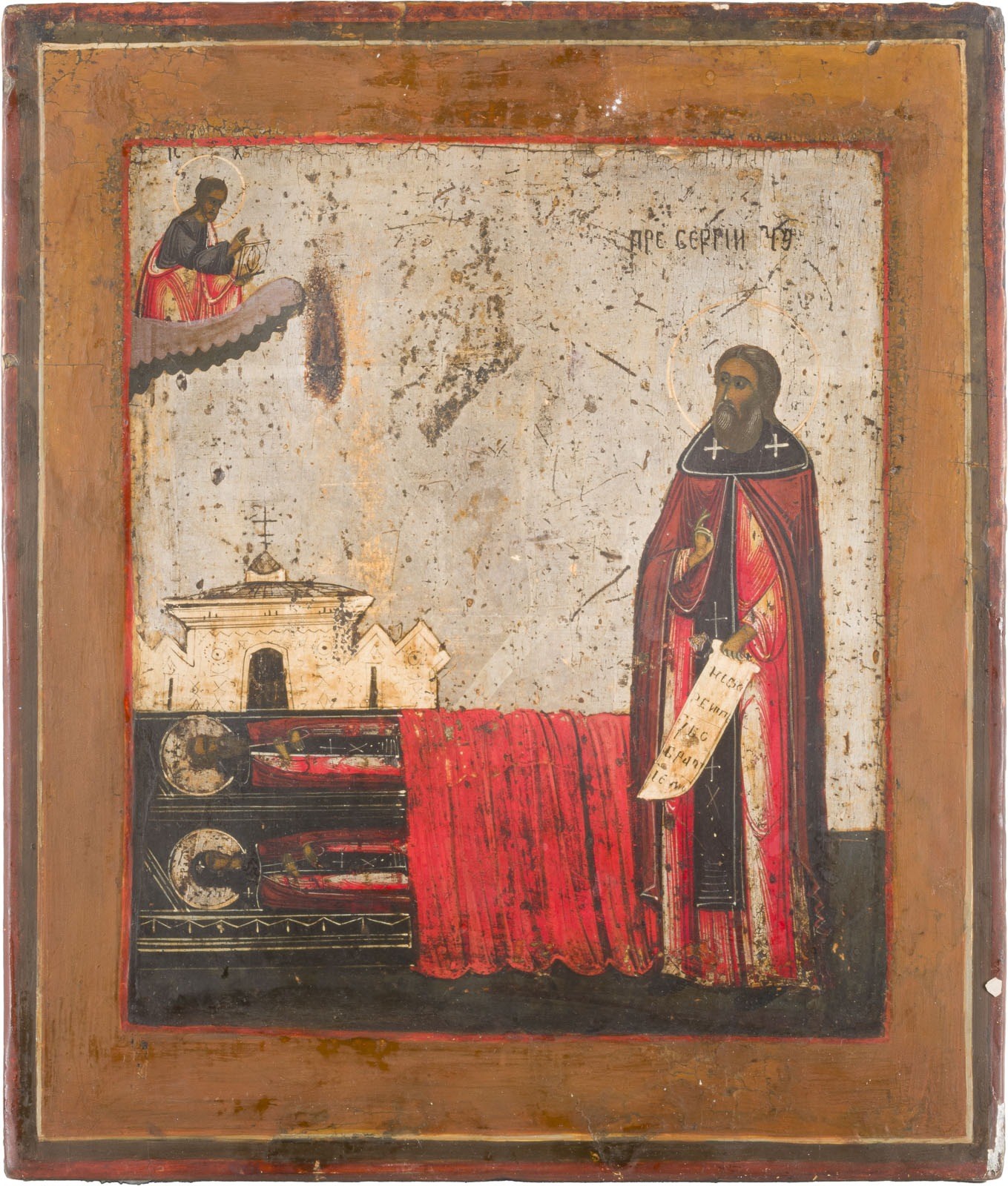 AN ICON SHOWING ST. SERGEY OF RADONEZH AT THE TOMB OF HIS PARENTS Russian, 19th century Tempera on wood panel with kovcheg. The background made of silver. Wearings. 31 x 26.2 cm.