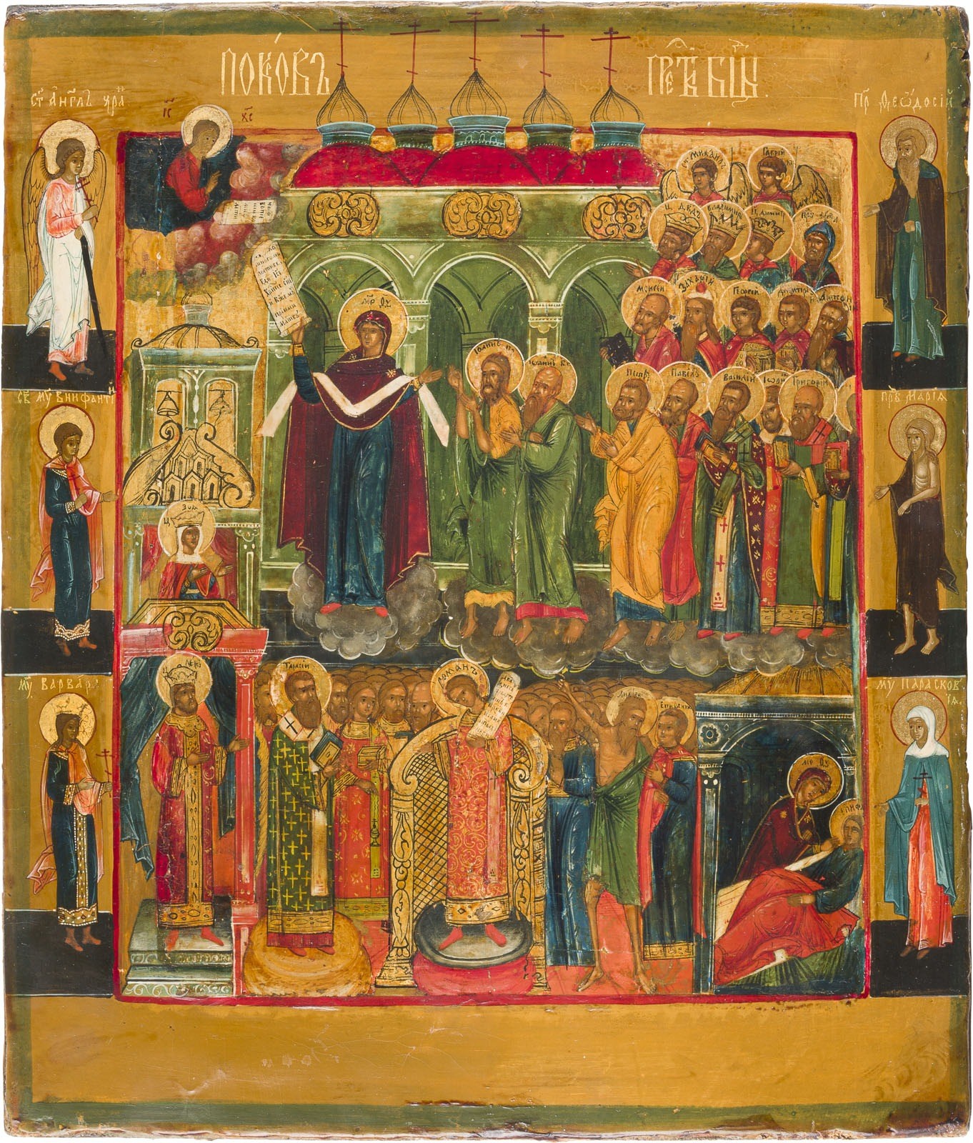 AN ICON SHOWING THE PROTECTING VEIL OF THE MOTHER OF GOD (POKROV) Russian, 19th century Tempera on wood panel with kovcheg. The haloes made of gold. Six selected saints on the borders, the Guardian Angel and St. Boniface among them. Vertical crack restored. 35.5 x 30.6 cm.
