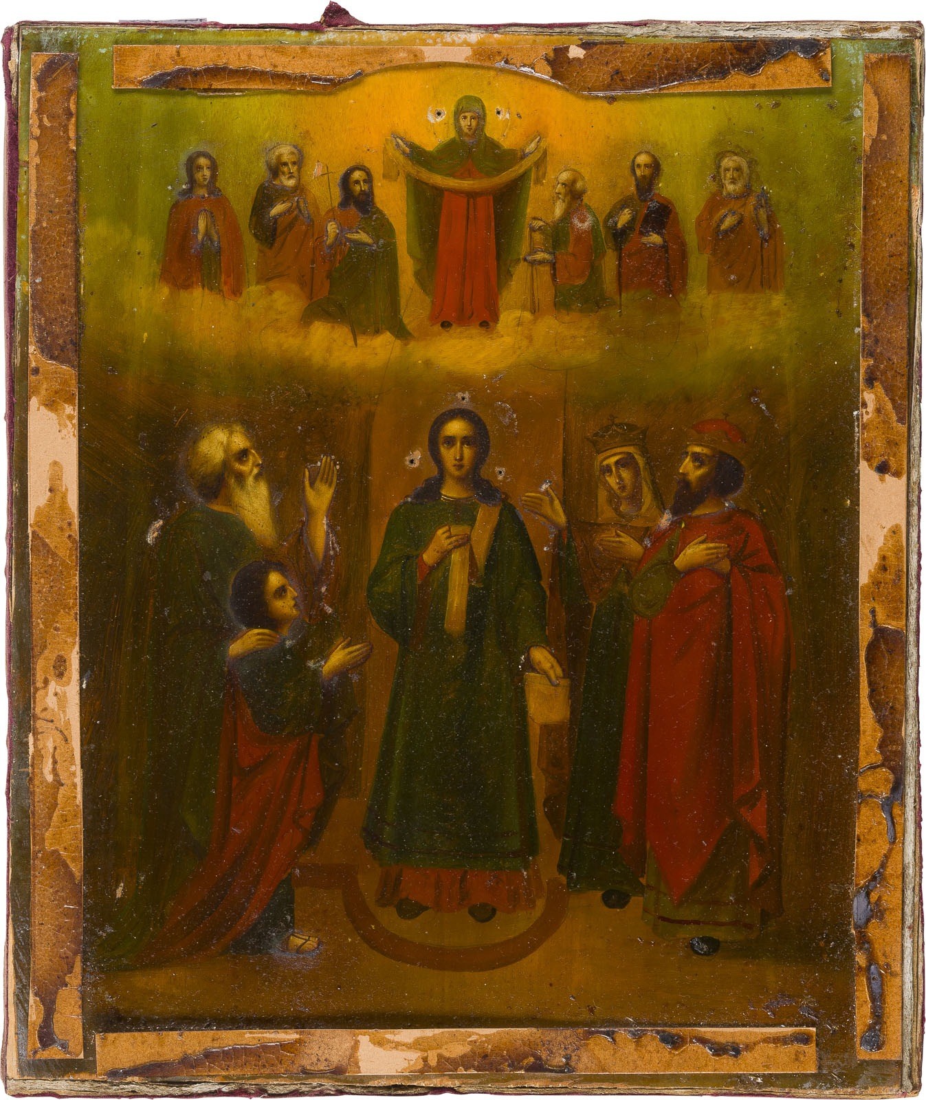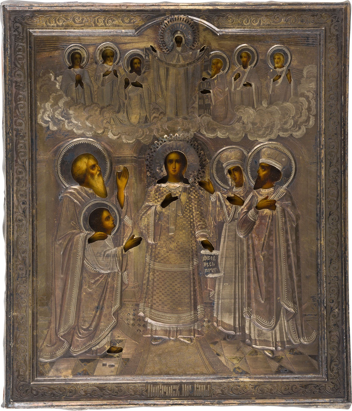 IKONE MIT DEM SCHLEIERWUNDER DER GOTTESMUTTER (POKROW) MIT VERMEIL-OKLAD