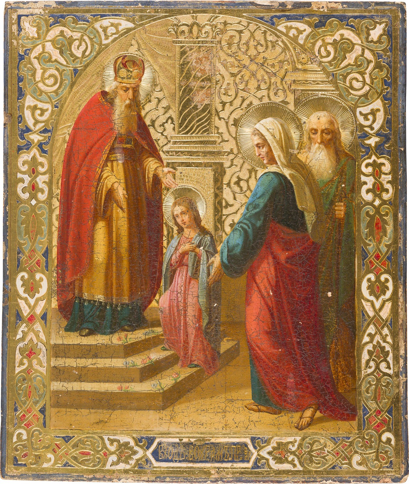 AN ICON SHOWING THE ENTRY OF THE MOTHER OF GOD INTO THE TEMPLE Russian, late 19th century Oil on wood panel. The background and border decorated with engraved stylized patterns emulating the metal oklads of contemporary icons. Wearings. 31 x 26.5 cm.