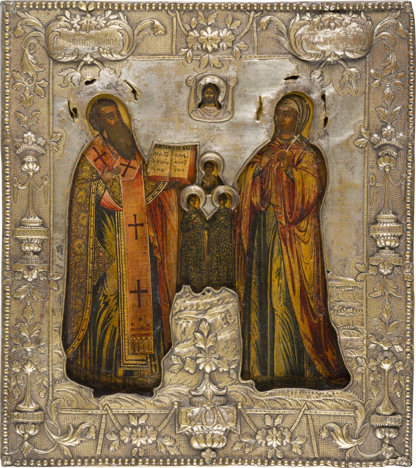 AN ICON OF SAINT BASIL THE GREAT AND SAINT MAKILINA WITH RIZA Russian, late 18th century Tempera on wood panel, with an embossed brass riza. Halos missing, partial restorations. 33 x 29.5 cm.
